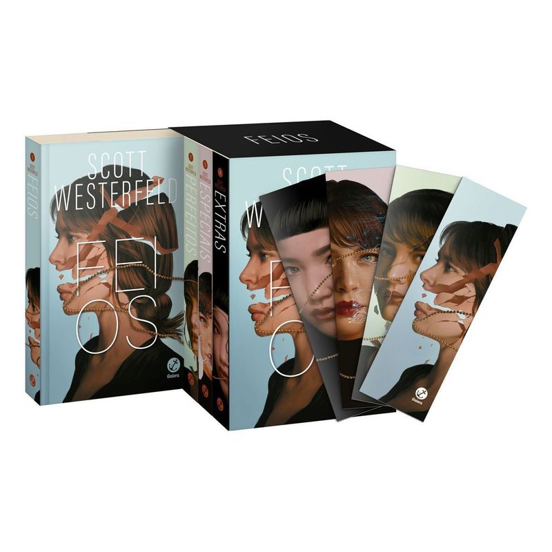 Reunida em um box e com brindes e capas estilizadas, a emblemática série Feios transporta o leitor para um mundo distópico movido pela busca por perfeição e fama a qualquer custo. Mas será que o futuro imaginado por Scott Westerfeld está tão distante assim dos dias atuais? Em uma realidade pós-apocalíptica, todo mundo nasce feio. E Tally Youngblood não vê a hora de completar dezesseis anos e finalmente ganhar a cirurgia para se tornar a versão perfeita de si mesma — com rosto, pele e ossos reconstruídos. Mas, enquanto conta os dias para o tão esperado momento, ela descobre que os rebeldes podem estar mais perto do que imagina, tentando derrubar o sistema do qual ela tanto deseja fazer parte.No decorrer dos três primeiros volumes da série — Feios, Perfeitos e Especiais —, Tally se verá dividida entre o que sempre almejou e verdades recém-descobertas sobre o mundo dos perfeitos. Em meio a aventuras, anseios e ações insurgentes, ela terá que aprender a lidar com as consequências de suas próprias decisões.Uma geração depois, o mundo continua sendo desafiador. Desta vez, no quarto volume, Extras, Aya Fuse vive em uma sociedade cuja única maneira de ser relevante é se tornar famoso da noite para o dia. Porém, ao tentar alcançar o status de celebridade, ela acaba se vendo diante de um dilema crucial: vale tudo pela fama?Instigante, a série Feios levanta temas que, mesmo após quase duas décadas de lançamento, ainda têm tudo a ver com a sociedade contemporânea, principalmente ao abordar a grande importância atribuída à beleza e a consequente busca pelo corpo e rostos perfeitos, sem deixar de tratar de questões relacionadas à individualidade, à amizade e aos mecanismos de controle social.“Uma série extraordinária.” – Kirkus Reviews