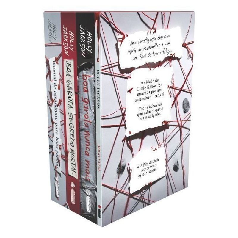 Box exclusivo reúne a série completa da autora Holly Jackson sobre uma investigação obsessiva, cheia de reviravoltas e com um final de tirar o fôlego A cidade de Little Kilton foi marcada por um assassinato terrível. Todos achavam que sabiam quem era o culpado… até uma adolescente decidir reescrever essa história. Na série best-seller do New York Times, que já vendeu mais de 100 mil exemplares no Brasil, a autora Holly Jackson constrói uma trama envolvente, assustadora e inesquecível. Agora em um box exclusivo, a trilogia principal é acompanhada do prelúdio Jogo fatal, que mostra como era a vida de Pip Fitz-Amobi antes de tudo mudar para sempre. Em Jogo fatal, uma brincadeira inocente dá início à carreira de Pip como detetive amadora. Durante um jogo de investigação com os amigos, ela se entrega a um mundo imaginário cheio de intrigas, segredos e sangue. Conforme analisa as pistas e elimina suspeitos, a garota descobre um lado de si mesma que não conhecia. E o crime fictício não é o único em sua mente… afinal, a cidade de Little Kilton é famosa por um assassinato bem real. Em Manual de assassinato para boas garotas, prestes a se formar no Ensino Médio, Pip decide analisar o crime que marcou a sua cidade em seu projeto de conclusão de curso. Cinco anos atrás, Andie Bell, a garota mais bonita e popular da escola, foi assassinada pelo namorado, Sal Singh, que se suicidou após o crime. Pelo menos, essa é a versão oficial. Mas Pip tem a impressão de que há peças faltando nesse quebra-cabeça. Porém, quando a pesquisa revela segredos aterrorizantes, ela percebe que se aproximar da verdade pode custar sua vida. Em Boa garota, segredo mortal, Pip acredita que seus dias de dete¬tive amadora chegaram ao fim. Até que um conhecido desaparece. Jamie Reynolds foi visto pela última vez no memorial dedicado a Andie Bell e Sal Singh, seis anos após o crime. Seria mera coincidência? Quando a polícia se recusa a agir, Pip se lança em uma busca frenética para encontrá-lo antes que seja tarde demais. Cada segundo conta, e só resta uma certeza: ninguém em Little Kilton é quem diz ser. Em Boa garota nunca mais, Pip está prestes a ir para a faculdade, mas ainda é assombrada pelo desfecho de suas últimas investigações. Após uma série de eventos estranhos, ela percebe que está sendo perseguida de verdade. E pior: seu stalker pode estar conectado a um assassino que aterrorizou a região na mesma época do caso de Andie Bell. Pip precisa descobrir quem está por trás disso… antes que se torne a próxima vítima. Aconteça o que acontecer, seus dias de boa garota vão chegar ao fim.