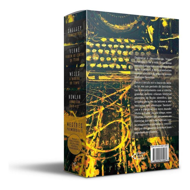 O BOX QUE REÚNE OS PRIMEIROS MESTRES DA FICÇÃO CIENTÍFICA. Desbravar o desconhecido. Viajar no tempo. Criar a vida. Essas ideias sempre habitaram o imaginário dos seres humanos, e até hoje embalam nossos sonhos e algumas de nossas histórias favoritas. Entre o século 19 e o início do século 20, em um período de descobertas e encantamento com a ciência, grandes autores criaram histórias pioneiras de ficção científica, que levaram gerações de leitores a embarcarem em aventuras fantásticas e a imaginar um novo mundo. Muito à frente de seu tempo, esses Mestres Primordiais pensaram em histórias que até hoje habitam nosso imaginário e ajudaram a consolidar um dos gêneros literários mais populares do planeta