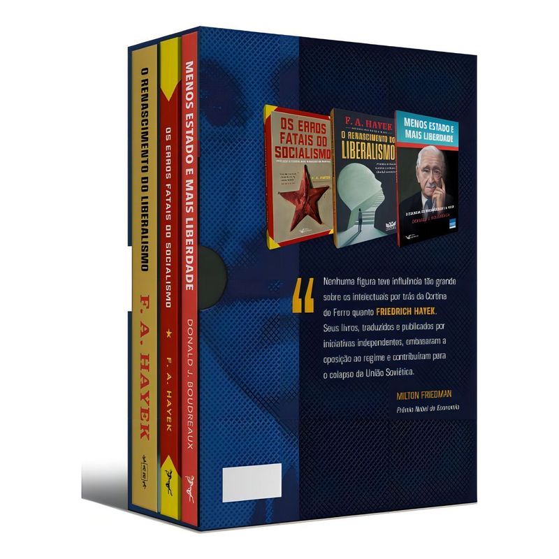 Neste box composto por três livros você vai conhecer o melhor de Friedrich Hayek. Nenhuma figura teve influência tão grande sobre os intelectuais por trás da Cortina de Ferro quanto Friedrich Hayek. Seus livros, traduzidos e publicados por iniciativas independentes, embasaram a oposição so regime e contribuíram para o colapso da União Soviética. Títulos: Os erros fatais do socialismo O renascimento do liberalismo Menos estado e mais liberdade