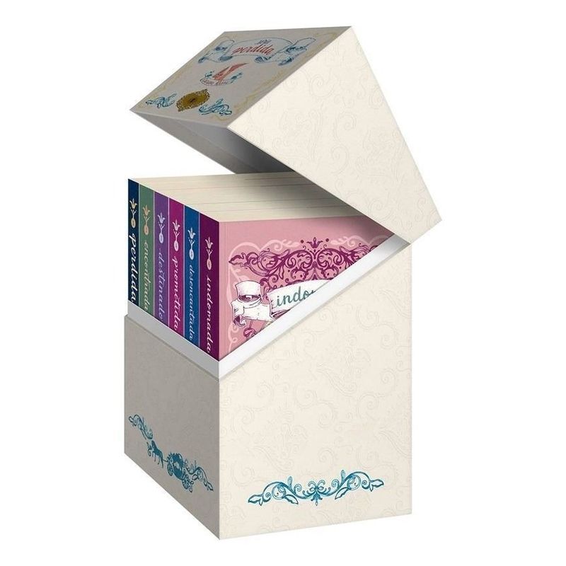 A série Perdida, o maior sucesso de Carina Rissi, chega com novas capas ilustradas e brindes exclusivos, reunidos em um box-baú que vai deixar os leitores ainda mais encantados! Perdida conta a aventura apaixonante de Sofia, uma garota moderna e irreverente que vai parar no século dezenove, sem ter ideia de como voltar para casa — ou se isso sequer é possível. Mas, ao conhecer o encantador Ian Clarke, a aflição por se ver em um tempo que não é o seu dará lugar a sentimentos muito mais agradáveis… Em Encontrada, Sofia percebe que se tornar parte da família Clarke não vai ser tão simples quanto imaginava. Terá que se esforçar para se encaixar em um mundo tão diferente, com hábitos e costumes que muitas vezes ela não compreende — o que gera gafes e confusões. Mas ela está disposta a enfrentar qualquer obstáculo para conquistar o seu felizes para sempre. Finalmente casado com a mulher que ama, Ian Clarke é um homem de sorte e sabe muito bem disso. Entretanto, em Destinado, volume contado pela perspectiva do príncipe encantado de Sofia, a felicidade de Ian começa a ruir. No baile de aniversário de sua irmã, Elisa, a menina se torna alvo de um escândalo, e um assunto do passado que há muito o persegue retorna para assombrá-lo. Aterrorizado com a possibilidade de perder Sofia, Ian fará o possível para proteger sua amada, sem se importar com as consequências. Em Prometida os leitores vão conhecer a história de Elisa, a doce porém decidida irmã de Ian Clarke, que ignorou as normas sociais da época em que vive e acabou envolvida num escândalo. E noiva de um homem que só beijou uma vez! Destinados a ficar juntos, mas separados pelo coração, Lucas e Elisa vão se envolver em uma sinuosa dança, marcada por segredos, mágoas do passado, intrigas e uma arrebatadora paixão, que vai pôr em risco não apenas seus sentimentos, mas a vida de ambos. Diferente de Elisa, Valentina de Albuquerque descobriu muito cedo que não é nenhuma princesa encantada. Em vez de bailes e romance, tudo que a jovem deseja é encontrar um jeito de viver com dignidade longe do pai e da madrasta. Valentina está quase desistindo do amor, mas, em Desencantada, o destino parece decidido a contrariá-la. Um equívoco embaraçoso sela o noivado da moça com o irritante e atraente Leon Navas. E, após um terrível acidente, Valentina vai atrás do responsável e acaba sucumbindo à irresistível e devastadora paixão por Leon, sem se dar conta de que o perigo ainda está à espreita… No arrebatador volume final da série que conquistou os leitores, você conhecerá Marina e Ana Laura, as filhas de Sofia e Ian. Apaixonados e felizes, a vida da família Clarke não poderia ser melhor! Ou assim eles pensavam. Um problema na fábrica ameaça enviar Sofia para a prisão e pode abalar seu casamento. E as irmãs Nina e Analu têm a cumplicidade estremecida depois do noivado da primeira, deixando Analu desolada. Entre segredos do presente e do passado, novas e antigas paixões, traições e lealdade, mãe e filhas farão o impossível umas pelas outras — e acabarão descobrindo, em Indomada, que os laços inquebráveis do amor podem, sim, se partir… Ao longo de duas décadas — que rendem duas filhas, grandes amigos e muitas histórias —, Sofia e Ian vão enfrentar desafios enormes e provar mais uma vez que o verdadeiro amor ultrapassa todas as barreiras. Até a do tempo.