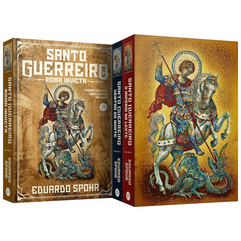 O Box Santo Guerreiro reúne a trilogia completa de Eduardo Spohr, que conta a biografia de São Jorge de uma perspectiva histórica, jogando luz sobre esse personagem tão querido e admirado por milhares de fiéis em todo o planeta. A série Santo Guerreiro conta a versão mais fidedigna da vida de São Jorge já escrita. Com base em documentos históricos e vestígios arqueológicos, o autor nos transporta de volta à Antiguidade tardia, um tempo em que o aço, o amor e a intriga governavam o destino dos homens — e, por conseguinte, os rumos da história.Santo Guerreiro: Roma Invicta (588 páginas)No fim do terceiro século, o Império Romano estava à beira do colapso. Invasões bárbaras, confrontos religiosos e insurreições militares ameaçavam a soberania dos césares. No Leste, a poderosa rainha Zenóbia reuniu uma tropa de guerreiros montados e assumiu o controle da Síria. Caráusio, o almirante da frota romana no Canal da Mancha, ocupou as províncias do Oeste e se autoproclamou imperador da Britânia.Em meio à desordem e ao caos, Laios Graco, alto oficial da cavalaria, é morto e suas terras, roubadas. Seu filho, o jovem Georgios, foge para a capital com o objetivo de se apresentar ao imperador Diocleciano, antigo companheiro de seu pai, na esperança de ser aceito no exército, tornar-se soldado, recuperar suas posses e vingar a família.Santo Guerreiro: Ventos do Norte (588 páginas)Este volume retrata os anos de juventude de Georgios como cavaleiro da Púrpura e tribuno militar, um dos mais altos cargos do exército romano.Para conter os distúrbios que ameaçavam o Império Romano, o jovem cavaleiro Georgios é enviado à fortaleza de Castra Vetera, às margens do rio Reno, no extremo norte da terra. Longe de casa, ele precisará enfrentar os rigores do clima e treinar os próprios soldados à medida que se prepara para a grande batalha contra os francos, a mais perigosa — e mais cruel — das tribos que então habitavam a Germânia.Santo Guerreiro: o Império do Leste (700 páginas)No princípio do século IV, o cristianismo já havia conquistado grande parte do mundo romano. Para conter o que considerava uma ameaça, Diocleciano dá início a uma sangrenta perseguição contra os líderes da Igreja, que, no entanto, esbarrará na resistência de Georgios Graco — ou São Jorge —, um de seus mais fiéis guarda-costas, um homem dividido entre a lealdade ao Império e o amor pelos valores cristãos.Neste volume, acompanhamos os momentos finais da trajetória do santo, sua participação na guerra contra os persas e seu martírio na cidade da Nicomédia.