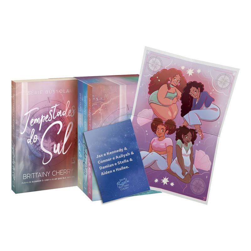 Brittainy Cherry prova que, seja qual for a direção que sua vida seguir, sempre haverá um grande amor esperando por você. Agora reunidos em um boxe exclusivo, os quatro livros da série Bússola são leituras indispensáveis para amantes de histórias românticas e de superação. Tempestades do Sul (336 páginas) Tudo o que Kennedy queria era fugir. Fugir de um casamento no qual não havia mais amor nem respeito e dos fantasmas que não paravam de atormentá-la. E a pequena Havenbarrow parecia o lugar perfeito para recomeçar sua vida. Ela só não contava que iria cair nos braços do bad boy da cidade logo de cara. E o pior: havia algo muito familiar naquele tal de Jax… Juntos, eles acabam descobrindo que são muito mais do que duas almas atormentadas em busca de redenção. Luzes do Leste (420 páginas) Nada melhor do que uma festa para curar um coração partido. Se for Halloween então, perfeito! Lá, Aaliyah pode ser apenas Chapeuzinho Vermelho, e não a estudante que sonha em ser uma grande jornalista. Só que, em vez do Caçador, ela é resgatada pelo Capitão América. Juntos, os dois têm uma noite mágica e, para não quebrar o encanto ao amanhecer, resolvem não relevar seus nomes. Até que, dois anos depois, ela tem a chance de ser promovida, mas, para isso, precisa conseguir uma entrevista exclusiva com o solteiro mais cobiçado de Nova York — Connor Roe. Para o mundo, ele é o empresário mais bem-sucedido do momento; para Aaliyah, ele é o super-herói que tocou seu coração. Ondas do Oeste (350 páginas) Depois de anos buscando pistas sobre suas origens, Damian Blackstone finalmente descobre que seu pai se chama Kevin Michaels. Ou melhor, se chamava, pois ele está morto. Kevin era dono de uma fortuna, que, de acordo com seu testamento, deve ser dividida entre Damian, seu filho biólogico, e Stella, sua filha de criação. Mas há uma condição para receberem a herança: os dois devem se casar e permanecer juntos por seis meses, senão tudo será dividido entre as três ex-esposas de seu pai, mulheres capazes de botar a madrasta má da Cinderela no chinelo. Estrelas do Norte (378 páginas) Hailee e Aiden cresceram juntos na pequena Leeks, e, desde que deixaram as implicâncias de lado, nunca mais se desgrudaram. Os dois sempre foram incentivadores um do outro acima de tudo, mas, quando o sentimento de amizade se torna uma paixão incontrolável, os dois têm de decidir o que é mais importante: a carreira artística de Aiden em ascensão ou viver o grande amor. Classificação indicativa: 18 anos.