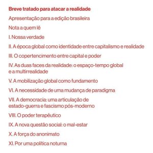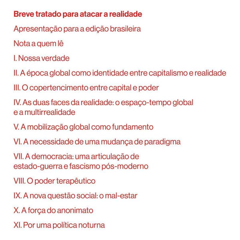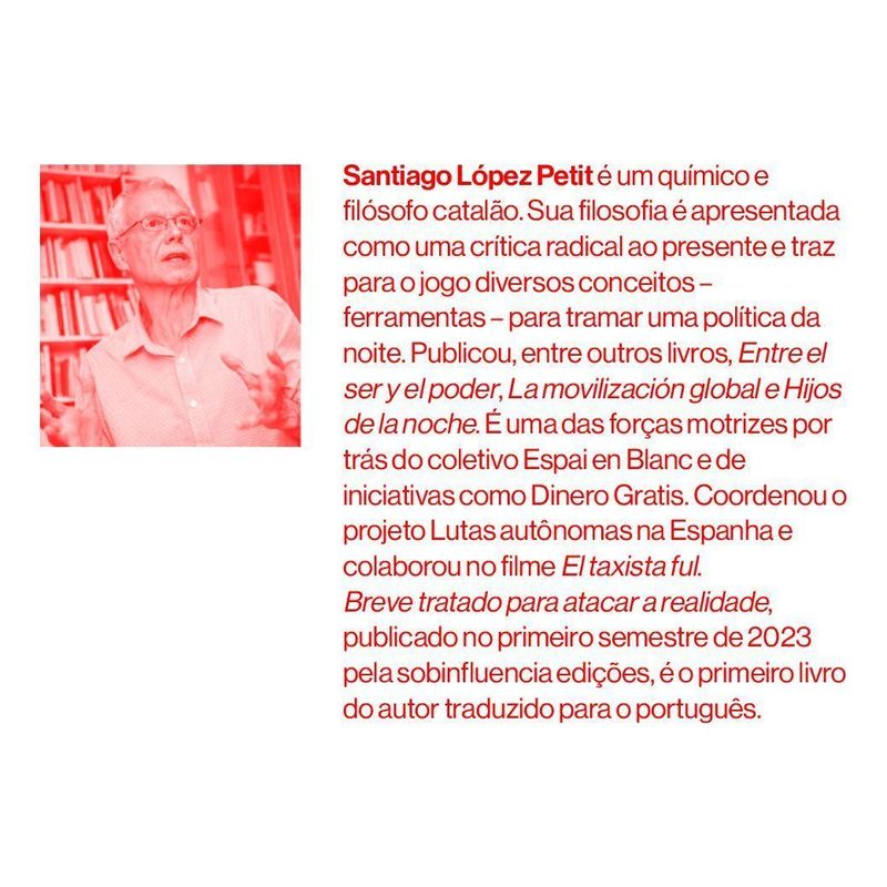 Este livro, como uma navalha, recorta e ataca seu objeto: a realidade. Não qualquer realidade, mas a nossa, a realidade capitalista.Consumindo tudo, sem deixar nada de fora, a realidade do capital torna-se absoluta e se desenvolve pelas demandas de seu interior, demonstrando-se em seu bolor e desvelando seu funcionamento. A globalização neoliberal é fundamento e força motriz da própria realidade. Avançadas tecnologias e definições ainda capturadas pela luz do real rompem o discurso e demonstram a democracia enquanto articulação do estado de guerra e do fascismo dito “pós-moderno”. Em seu desdobramento, em seu afastamento da tautologia, portanto, a realidade nos mostra suas fraquezas e seus membros carcomidos. “Breve tratado para atacar a realidade”, de Santiago López Petit, é um pacto com a noite – a política noturna na qual a realidade é indigesta; política que perfura a realidade, trespassando-a, com o mistério de algo escuro, macerado onde a luz não alcança, abrindo a possibilidade de uma nova política, uma política da noite.