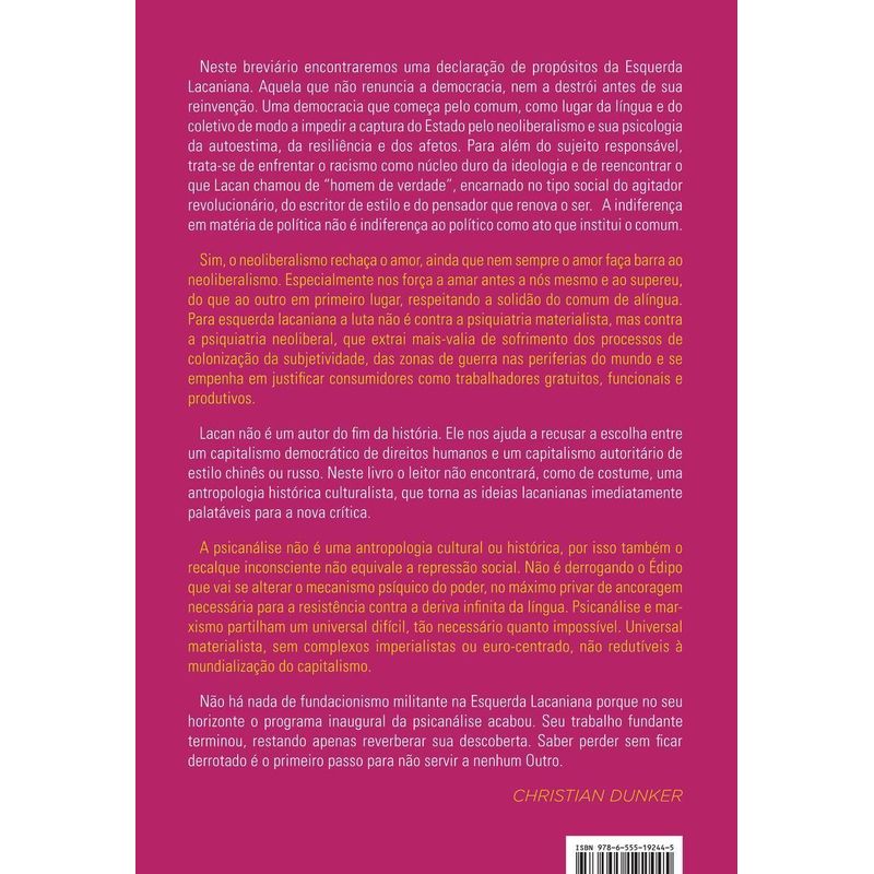 Jorge Alemán é um psicanalista, escritor e filósofo incomum daqueles que aparecem de tempos em tempos—como Slavoj Zizek—com um estilo acessível e provocador que explora de forma direta e didática como os discursos políticos moldam o desejo, a identidade e o inconsciente social, propondo novas formas de pensar a emancipação/resistência e o alcance do que chamamos a era do capitalismo globalizado. Amor; machismo; políticas de gênero; linguagem inclusiva; abordam parte significativa do repertorio de conceitos-chave que usamos no cotidiano para captar as circunstâncias sociais e subjetivas que implicam como podemos entender a economia, a política as relações sociais e amorosas. Inserido fortemente na tradição lacaniana, o autor analisa os mecanismos subjetivos que sustentam as ideologias dominantes e os processos políticos contemporâneos, com especial atenção ao pano de fundo das tensões do neoliberalismo, sendo uma voz ativa nos debates sobre o papel da subjetividade e da linguagem nas dinâmicas políticas atuais, combinando uma sólida base teórica com um profundo compromisso com a crítica social. Como um ensaio em pequenas formas de estilo extremamente agradável e conciso, o livro pode ser lido por blocos temáticos, conceitos específicos ou aleatoriamente, pois qualquer que seja a forma de entrada, o leitor ao final perceberá que o texto possui uma unidade própria. Embora pareça um lugar-comum em apresentações de livros, essa é, sem nenhuma dúvida, uma leitura indispensável para compreender as forças psíquicas e ideológicas que atuam nas sociedades modernas no momento em que caminhamos para um quarto do Século XXI, para enfrentar os desafios pessoais e coletivos que nos desafiam hoje e nos próximos anos. João Angelo Fantini – professor, escritor e psicanalista, com pós-doutorado no Birkbeck College (University of London). Autor e coautor de Bem-estar na Cultura: consumo de satisfações? (EDUSP, 2023); As Escritas do Ódio (Escuta, 2018), Raízes da Intolerância (Edufscar, 2014-Finalista Prêmio Jabuti); Imagens do Pai no Cinema – Clínica da Cultura entre outros; além de jornais e revistas acadêmicas é editor da Revista Leitura Flutuante da PUC – SP.