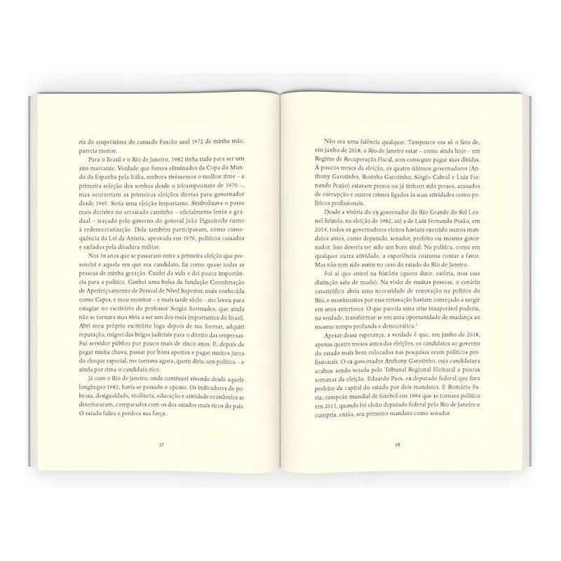 No segundo semestre de 2018, diante do quadro te- nebroso do estado do Rio de Janeiro – minado pela corrupção generalizada, com dois ex-governadores presos, uma gravíssima crise financeira e a ausência de alternativas políticas renovadoras –, o advogado carioca Marcelo Trindade concluiu que tinha que se posicionar. Não bastava apenas ocupar cargos técnicos no setor público e contribuir financeiramente para as causas nas quais acreditava, com vinha fazendo até aquele momento. Para ele e outros de sua geração, era chegada a hora de se colocar por inteiro no esforço de encontrar o caminho pela recuperação do estado. O caminho do centro é a história dessa candidatu- ra. Um relato cândido, genuíno, sem pretensão nem segundas intenções, cuja força está na autenticidade. Marcelo conta o que aconteceu e como viveu cada momento, abordando francamente inclusive os temas delicados da política e do estado, como a falta de au- tocrítica do empresariado e de realismo da esquerda, a urgência de se gastar mais com educação do que com a segurança, o território espinhoso das s so- ciais, a relação com a imprensa, os problemas do fi- nanciamento de campanha, entre outros. Um livro sobre política, mas escrito de uma pers- pectiva do cidadão. O caminho do centro fala de elei- ções e partidos, mas com a voz de um homem inde- pendente – um depoimento autêntico e corajoso, de indiscutível relevância no momento em que vivemos.
