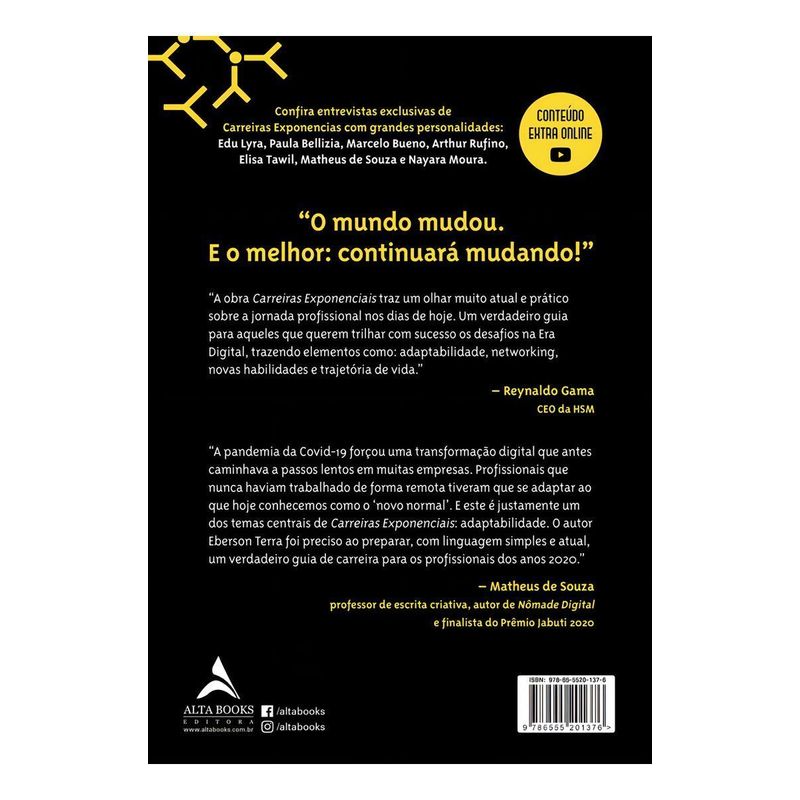 A pandemia alterou para sempre o mundo corporativo, desafiando ainda mais quem busca ser protagonista da própria jornada. De forma prática, Carreiras Exponenciais chega como um poderoso guia para ajudar a repensar, mapear e planejar cada passo do seu caminho profissional. Este livro apresenta uma nova forma de enxergar e desenvolver habilidades fundamentais para quem busca ascensão em um mundo cada vez mais plural e menos linear. Em qualquer ramo que decida atuar, viver exponencialmente na Era Digital demandará um novo conjunto de competências, reveladas pelo autor ao longo de seis dimensões que se unem em torno do bem mais precioso para qualquer ser humano: sua trajetória de vida. Eberson Terra é executivo da área da Educação, liderou times de mais de 2 mil pessoas e conquistou prêmios nacionais como o da Equipe Campeã do Reclame Aqui em 2016. Após um período sabático, decidiu se tornar consultor de negócios e transição de carreira. É um dos Top Voices do LinkedIn mais lidos no Brasil, e seu conteúdo foca o cotidiano do mundo corporativo, liderança, inovação e empreendedorismo.