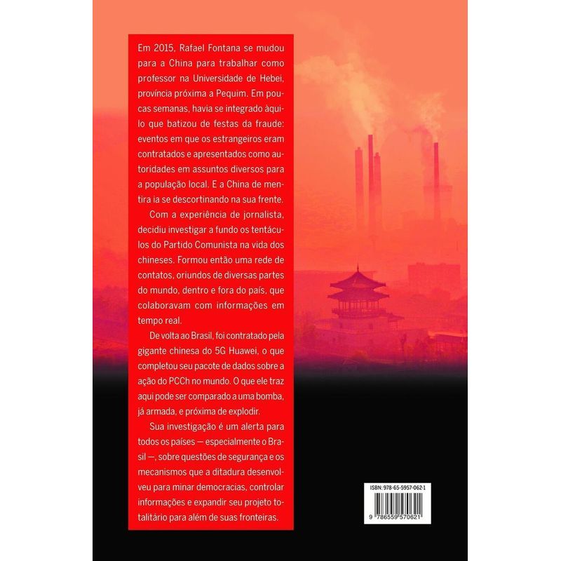 Em 2015, Rafael Fontana se mudou para a China para trabalhar como professor na Universidade de Hebei, província próxima a Pequim. Em poucas semanas, havia se integrado àquilo que batizou de festas da fraude: eventos em que os estrangeiros eram contratados e apresentados como autoridades em assuntos diversos para a população local. E a China de mentira ia se descortinando na sua frente. Com a experiência de jornalista, decidiu investigar a fundo os tentáculos do Partido Comunista na vida dos chineses. Formou então uma de contatos, oriundos de diversas partes do mundo, dentro e fora do país, que colaboravam com informações em tempo real. De volta ao Brasil, foi contratado pela gigante chinesa do 5G Huawei, o que completou seu pacote de dados sobre a ação do PCCh no mundo. O que ele traz aqui pode ser comparado a uma bomba, já armada, e próxima de explodir. Sua investigação é um alerta para todos os países – especialmente o Brasil –, sobre questões de segurança e os mecanismos que a ditadura desenvolveu para minar democracias, controlar informações e expandir seu projeto totalitário para além de suas fronteiras