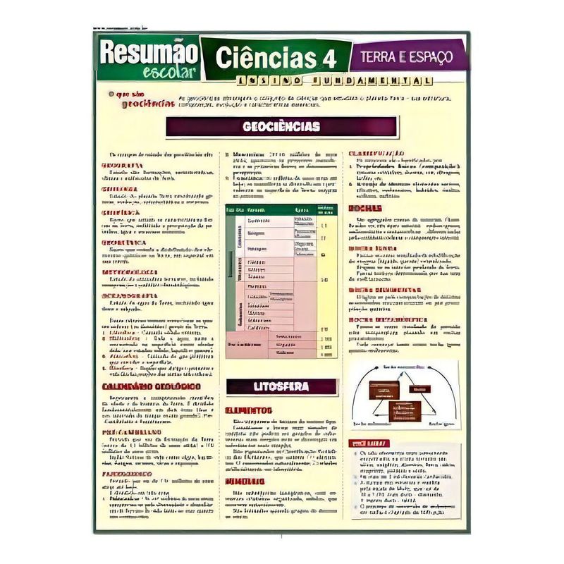 Neste Resumão você encontra os conceitos básicos das geociências e também: litosfera (minerais, rochas, camadas da terra, placas tectônicas e processos geológicos), hidrosfera (águas salgada e doce) e atmosfera (formação, organização, efeito estufa, tempo, ventos e tempestades). Na segunda parte, os princípios fundamentais das ciências do espaço e um guia básico do Universo e do Sistema Solar, com informações sobre cada planeta.