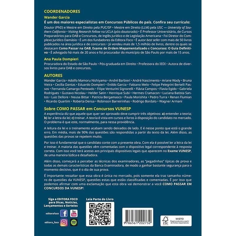 Sobre a Importância da Coleção como Passar A Coleção COMO PASSAR! é, hoje, líder no segmento de preparação para concursos públicos por meio da resolução de questões de provas anteriores. Dezenas de milhares de examinandos que estudaram pelas obras obtiveram aprovação e atingiram seus objetivos. Esses resultados decorrem do esforço e da experiência do coordenador e dos demais autores, bem como das características especiais de nossas obras, que são as únicas no mercado que trazem tamanho número de disciplinas, além da classificação dos temas e subtemas ao máximo, possibilitando que o examinando estude cada assunto dos editais dos concursos de modo organizado e planejado. Tudo sem contar o enorme custo-benefício de juntar tanto conteúdo num volume apenas, reduzindo custos e gasto de papel, de modo a gerar para o consumidor economia, respeito ao meio ambiente e praticidade. É por isso que os estudantes vêm chamando nosso livro de “O Melhor Amigo do Concurseiro”, num reconhecimento claro da indispensabilidade da obra para quem deseja ser aprovado em concursos jurídicos. Sobre a obra Como Passar em Concursos Vunesp – 2.000 Questões Comentadas – 7ª Ed -2025 A experiência diz que aquele que quer ser aprovado deve cumprir três objetivos: a) entender a teoria; b) ler a letra da lei; c) treinar. A teoria é vista em cursos e livros à disposição do candidato no mercado. O problema é que este, normalmente, para nessa providência. A leitura da lei e o treinamento acabam sendo deixados de lado. E é nesse ponto que está o grande erro. Em média, mais de 90% das questões são respondidas a partir do texto da lei. Além disso, as questões das provas se repetem muito. Por isso é fundamental que o candidato conte com a presente obra. Com ela é possível ler a letra da lei e treinar. A maioria das questões vêm comentadas com o dispositivo legal correspondente à resposta correta. Com isso você terá acesso aos principais dispositivos legais que aparecem no Exame VUNESP, de uma maneira lúdica e desafiadora. Além disso, começará a perceber as técnicas dos examinadores, as “pegadinhas” típicas de prova e todas as demais características da Banca Examinadora, de modo a ganhar bastante segurança para o momento decisivo, que é o dia de sua prova. É importante ressaltar que essa obra é única no mercado, pois somente ela traz tamanho número de questões da VUNESP, questões estas que estão classificadas e comentadas. É por isso que podemos afirmar com uma exclamação que esta obra vai demonstrar a você COMO PASSAR EM CONCURSOS DA VUNESP!