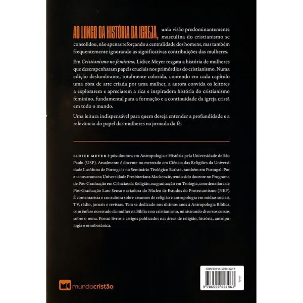 Ao longo da história da igreja, uma visão predominantemente masculina do cristianismo se consolidou, não apenas reforçando a centralidade dos homens, mas também frequentemente ignorando as significativas contribuições das mulheres. Em Cristianismo no feminino, Lidice Meyer resgata a história de mulheres que desempenharam papéis cruciais nos primórdios do cristianismo. Numa edição deslumbrante, totalmente colorida, contendo em cada capítulo uma obra de arte criada por uma mulher, a autora convida os leitores a explorarem e apreciarem a rica e inspiradora história do cristianismo feminino, fundamental para a formação e a continuidade da igreja cristã em todo o mundo. Uma leitura indispensável para quem deseja entender a profundidade e a relevância do papel das mulheres na jornada da fé.