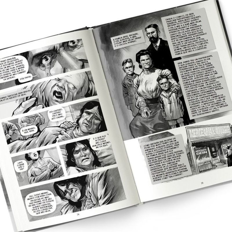 Um psicopata brutal. Uma série de assassinatos macabros. E um true crime tão perturbador que esgarçou os limites da realidade para ser eternizado na ficção de horror. Ed Gein, a graphic novel escrita por Harold Schechter — autor de Anatomia do Mal — e ilustrada pelo quadrinista Eric Powell é uma exploração profunda das origens do assassino necrófilo que assombrou os sonhos da América dos anos 1950.