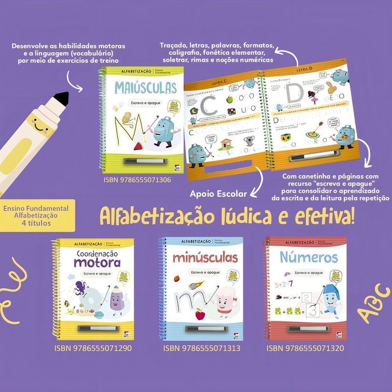 Nesta coleção de apoio escolar, a criança descobrirá a leitura e a escritura por meio de atividades de coordenação motora que ensinam a desenhar letras, números, linhas e formas, que podem ser feitas diversas vezes. Além disso, irá conhecer duas formas de letras: maiúscula e minúscula. Alfabetização – Ensino Fundamental, os primeiros passos rumo à aprendizagem lúdica e significativa.