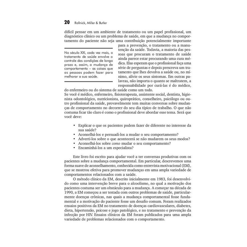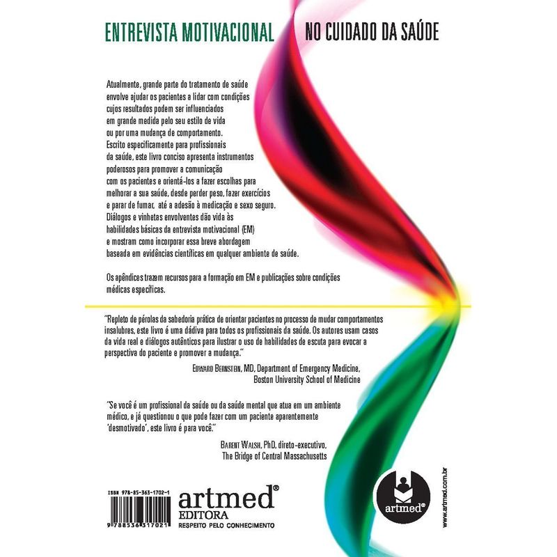 Escrito especificamente para profissionais da saúde, este livro conciso apresenta instrumentos poderosos para promover a comunicação com os pacientes e orientá-los a fazer escolhas para melhorar a sua saúde, desde perder peso, fazer exercícios e parar de fumar, até a adesão à medicação e sexo seguro. “Se você é um profissional da saúde ou da saúde mental que atua em um ambiente médico, e já questionou o que pode fazer com um paciente aparentemente ‘desmotivado’, este livro é para você.” Barent Walsh, PhD, direto-executivo, The Bridge of Central Massachusetts.