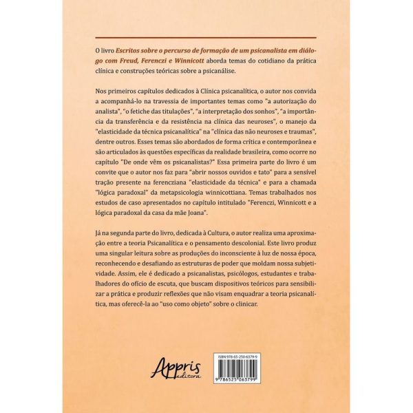 O livro Escritos sobre o percurso de formação de um psicanalista em diálogo com Freud, Ferenczi e Winnicott aborda temas do cotidiano da prática clínica e construções teóricas sobre a psicanálise. Nos primeiros capítulos dedicados à Clínica psicanalítica, o autor nos convida a acompanhá-lo na travessia de importantes temas como “a autorização do analista”, “o fetiche das titulações”, “a interpretação dos sonhos”, “a importância da transferência e da resistência na clínica das neuroses”, o manejo da “elasticidade da técnica psicanalítica” na “clínica das não neuroses e traumas”, dentre outros. Esses temas são abordados de forma crítica e contemporânea e são articulados às questões específicas da realidade brasileira, como ocorre no capítulo “De onde vêm os psicanalistas?” Essa primeira parte do livro é um convite que o autor nos faz para “abrir nossos ouvidos e tato” para a sensível tração presente na ferencziana “elasticidade da técnica” e para a chamada “lógica paradoxal” da metapsicologia winnicottiana. Temas trabalhados nos estudos de caso apresentados no capítulo intitulado “ Ferenczi, Winnicott e a lógica paradoxal da casa da mãe Joana.” Já na segunda parte do livro, dedicada à Cultura, o autor realiza uma aproximação entre a teoria Psicanalítica e o pensamento descolonial. Este livro produz uma singular leitura sobre as produções do inconsciente à luz de nossa época, reconhecendo e desafiando as estruturas de poder que moldam nossa subjetividade. Assim, ele é dedicado a psicanalistas, psicólogos, estudantes e trabalhadores do ofício de escuta, que buscam dispositivos teóricos para sensibilizar a prática e produzir reflexões que não visam enquadrar a teoria psicanalítica, mas oferecê-la ao “uso como objeto” sobre o clinicar.