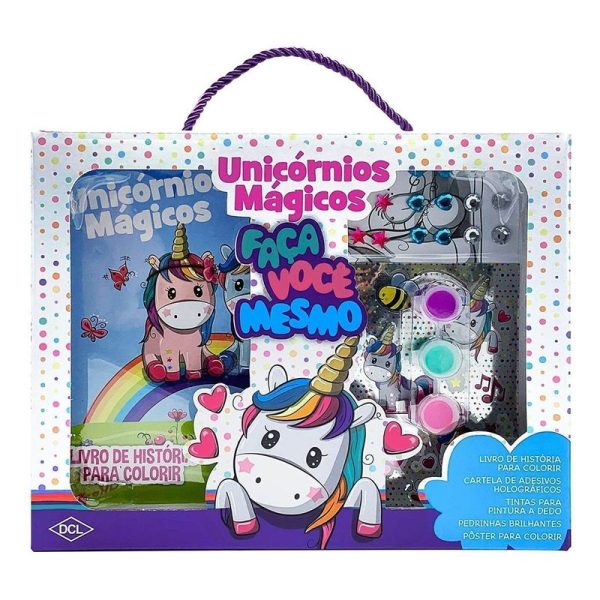 O kit Faça Você Mesmo traz um livro repleto de imagens para colorir de Unicórnios, tintas para pintura a dedo, adesivos e pedrinhas para decorar, excelentes para trabalhar o desenvolvimento motor, a criatividade e a concentração.