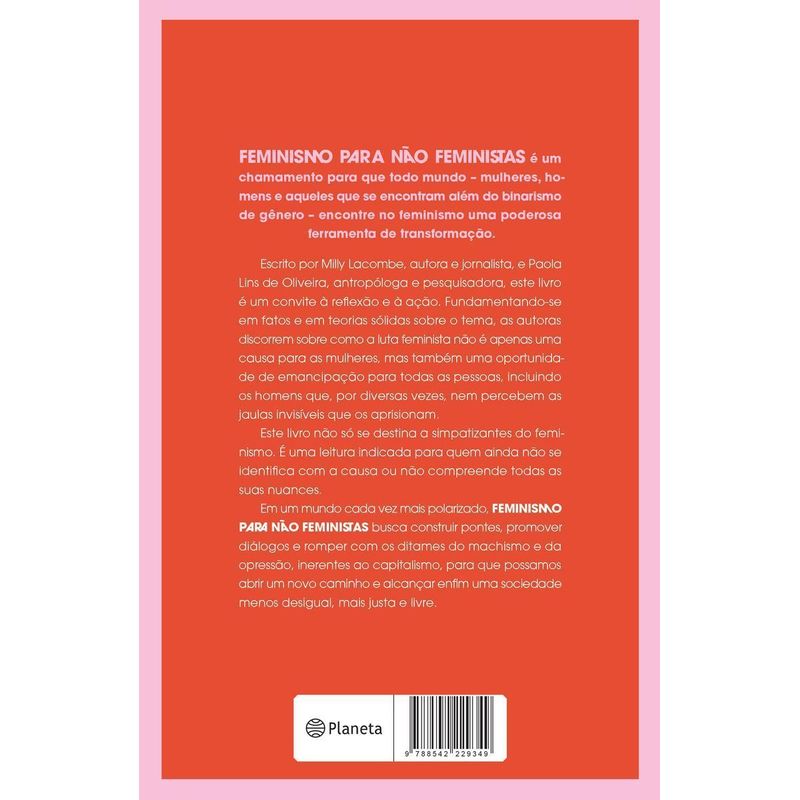 FEMINISMO PARA NÃO FEMINISTAS é um chamado para que todos – homens, mulheres e aqueles que se encontram além do binarismo de gênero – descubram no feminismo uma poderosa ferramenta de transformação. Escrito por Milly Lacombe, autora e jornalista, e Paola Lins de Oliveira, doutora em Antropologia, este livro é um convite à ação. Fundamentando-se em fatos e em teorias sólidas sobre o tema, as autoras discorrem sobre como a luta feminista não é apenas uma causa para as mulheres, mas também uma oportunidade de emancipação para todas as pessoas, incluindo os homens que, por diversas vezes, nem percebem as jaulas invisíveis que os aprisionam. Este livro não só se destina a simpatizantes do feminismo. É um convite para aqueles que ainda não se identificam com a causa ou não compreendem todas as suas nuances. Em um mundo cada vez mais polarizado, FEMINISMO PARA NÃO FEMINISTAS busca construir pontes, promover diálogos e romper com os ditames do machismo e da opressão, inerentes ao capitalismo, para que possamos abrir um novo caminho e alcançar enfim uma sociedade menos desigual, mais justa e livre.
