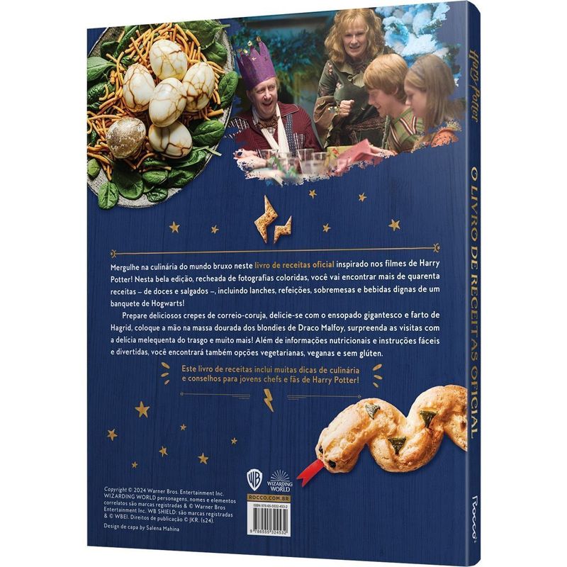 Mergulhe na culinária do mundo bruxo neste livro de receitas oficial inspirado nos filmes de Harry Potter! Nesta bela edição, recheada de fotografias coloridas, você vai encontrar mais de quarenta receitas — de doces e salgados —, incluindo lanches, refeições, sobremesas e bebidas dignas de um banquete de Hogwarts! Prepare deliciosos crepes de correio-coruja, delicie-se com o ensopado gigantesco e farto de Hagrid, coloque a mão na massa dourada dos blondies de Draco Malfoy, surpreenda as visitas com a delícia melequenta do trasgo e muito mais! Além de informações nutricionais e instruções fáceis e divertidas, você encontrará também opções vegetarianas, veganas e sem glúten. Este livro de receitas inclui muitas dicas de culinária e conselhos para jovens chefs e fãs de Harry Potter!