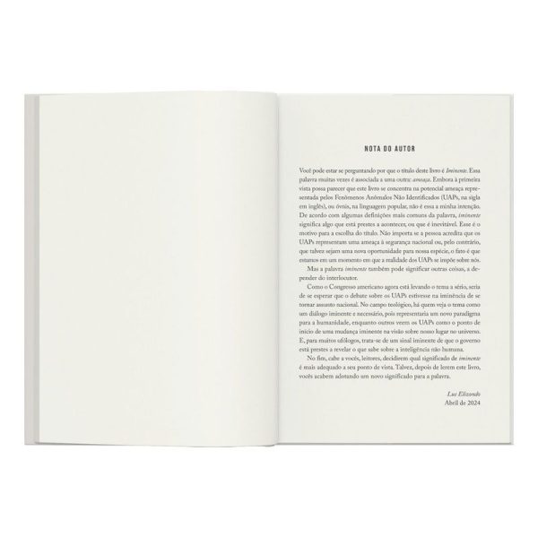 LUIS “LUE” ELIZONDO é um ex-oficial sênior de inteligência e ex-agente especial que foi recrutado para trabalhar em um programa altamente sigiloso do governo dos Estados Unidos que investigava UAPs. Mesmo com décadas de experiência adquirida trabalhando em alguns dos programas mais confidenciais do país, Lue não estava preparado para o que viria a descobrir. Durante anos, Elizondo e seus colegas estiveram na linha de frente do que pode ser o maior mistério da história e da maior operação de encobrimento de UAPs já vista. Objetos não identificados que parecem colocar à prova nosso entendimento de como a física funciona — no ar, na água e no espaço — têm operado com absoluta impunidade desde a Segunda Guerra Mundial. Os militares, a CIA e até mesmo ex-presidentes sabem da verdade de que a humanidade, de fato, não é a única forma de vida inteligente no universo. A inteligência não humana que controla esses UAPs está vigiando bases militares americanas estratégicas e já interferiu em operações militares e nucleares. Membros do governo americano e agentes da inteligência que encontraram UAPs sofreram ferimentos físicos graves.Os riscos não poderiam ser maiores. Iminente revela, em primeira mão, o segredo mais bem guardado do Pentágono e faz um chamado para confrontarmos uma das maiores questões existenciais da humanidade.