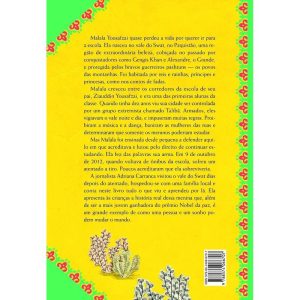 Malala Yousafzai quase perdeu a vida por querer ir para a escola. Ela nasceu no vale do Swat, no Paquistão, uma região de extraordinária beleza, cobiçada no passado por conquistadores como Gengis Khan e Alexandre, o Grande, e protegida pelos bravos guerreiros pashtuns – os povos das montanhas. Foi habitada por reis e rainhas, príncipes e princesas, como nos contos de fadas. Malala cresceu entre os corredores da escola de seu pai, Ziauddin Yousafzai, e era uma das primeiras alunas da classe. Quando tinha dez anos viu sua cidade ser controlada por um grupo extremista chamado Talibã. Armados, eles vigiavam o vale noite e dia, e impuseram muitas regras. Proibiram a música e a dança, baniram as mulheres das ruas e determinaram que somente os meninos poderiam estudar. Mas Malala foi ensinada desde pequena a defender aquilo em que acreditava e lutou pelo direito de continuar estudando. Ela fez das palavras sua arma. Em 9 de outubro de 2012, quando voltava de ônibus da escola, sofreu um atentado a tiro. Poucos acreditaram que ela sobreviveria. A jornalista Adriana Carranca visitou o vale do Swat dias depois do atentado, hospedou-se com uma família local e conta neste livro tudo o que viu e aprendeu por lá. Ela apresenta às crianças a história real dessa menina que, além de ser a mais jovem ganhadora do prêmio Nobel da paz, é um grande exemplo de como uma pessoa e um sonho podem mudar o mundo.