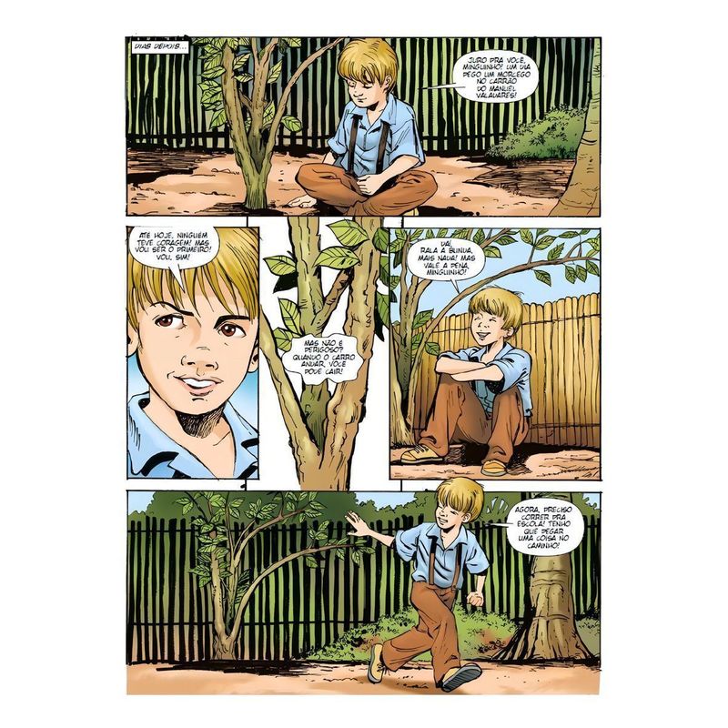 Quem leu o livro O Meu Pé de Laranja Lima jamais esquece as aventuras e as desventuras do herói-menino Zezé. Por isso, por ter se tornado uma das histórias mais amadas pelo público de todas as idades, foi contada no cinema, em novela da tevê, publicada em 23 países e traduzida em 15 idiomas. Um grandioso sucesso. Agora, você ganha a oportunidade de reviver – ou conhecer – toda essa emoção e essa torcida por Zezé nas páginas desta edição em quadrinhos. Ele tem 6 anos. Sua família é pobre e, com o pai desempregado, vive um momento bastante difícil. Em casa, tem aqueles que o adoram, mas tem também os que não entendem seu jeito livre de ser, e o maltratam, tornando sua vida quase insuportável. Mas o menino possui algo só seu: sua imaginação. É isso que torna o mundo de dor que o cerca em encantamento, a ponto de ele fazer amizade com um pé de laranja-lima — uma arvorezinha com quem conversa e brinca. Outros personagens vão surgir, tornando a história mais e mais tocante. Zezé vai descobrir a felicidade, mas também a perda e o sofrimento. Trata-se de uma narrativa que se torna parte da gente.