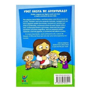 Você gosta de aventuras? Então, segure-se! Agora você vai viver a maior aventura da sua vida. Nas páginas desta Bíblia, você lerá sobre como foi a criação do mundo. Também verá uma serpente malvada; navegará em um barco gigante repleto de animais; montará em camelos por entre as pirâmides; conhecerá a terra da qual manam leite e mel; contemplará faraós e princesas; observará dez pragas assolarem uma terra magnífica; verá um pequeno pastor matando o terrível gigante; e conhecerá reis sábios e justos. E o mais importante: você conhecerá a ele, a Jesus de Nazaré. O filho de Deus que veio dar uma nova esperança ao mundo. Leia as páginas deste livro e descubra o que ele fez por você.