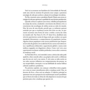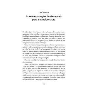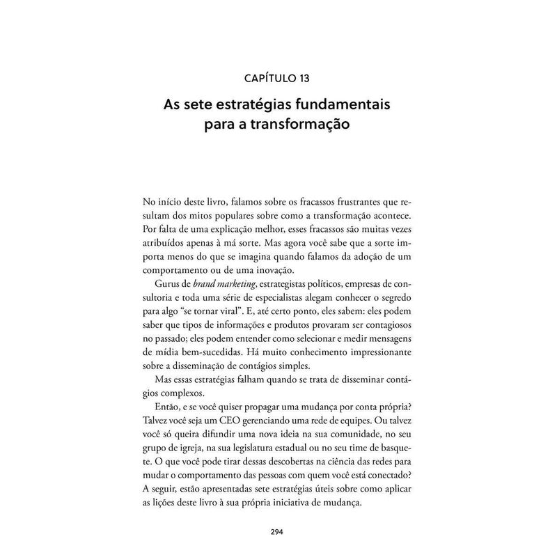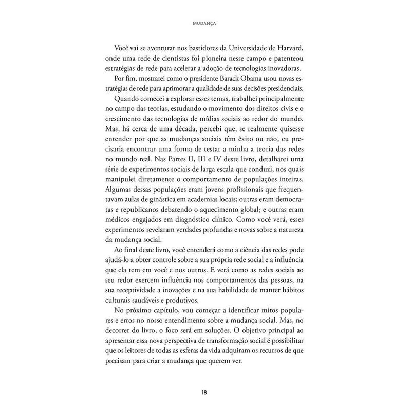 “Uma leitura completamente fascinante, que vai desafiar o que você pensa sobre como as mudanças na sociedade acontecem.” – ADAM GRANT, autor de “Originais”, “Dar e receber” e “Pense de novo” “Um guia notável e importante para tornar efetivas as mudanças na nossa vida pessoal, nos negócios, na sociedade e além.” – JONAH BERGER, autor de “Contágio: por que as coisas pegam” “Esta é uma leitura obrigatória e oportuna para qualquer líder que queira encarar de frente as forças da resistência e conduzir o comportamento para caminhos positivos.” – ROSABETH MOSS KANTER, renomada autora e professora da Harvard Business School *** Da disseminação do coronavírus ao aumento da polarização política, da Primavera Árabe ao #MeToo, da Nasa à Netflix, de protestos nas ruas a novas estratégias de gestão em uma empresa, você já se perguntou por que algumas mudanças são capazes de impactar – e transformar – completamente a nossa sociedade, enquanto outras simplesmente fracassam? Neste livro, o premiado professor e pesquisador Damon Centola analisa alguns dos movimentos, produtos e serviços mais inovadores dos últimos séculos e nos apresenta a ciência das redes, uma nova e fascinante teoria que ele próprio ajudou a criar e que desafia tudo o que pensávamos a respeito de como novas ideias se propagam na sociedade – e como elas podem ser adotadas ou rejeitadas da noite para o dia. E o melhor é que, com as sete estratégias estudadas pelo autor a partir de histórias reais envolvendo política, saúde, tecnologia, entretenimento e finanças, essa teoria inovadora pode ser colocada em prática por você. Entenda o papel que pessoas no seu entorno exercem em você, no comportamento dos outros e na receptividade a inovações e hábitos culturais saudáveis e altamente produtivos. A ciência das redes o tornará capaz de influenciar pessoas e liderar mudanças afirmativas e duradouras ao seu redor, seja no trabalho, em casa ou na comunidade.