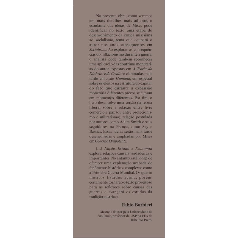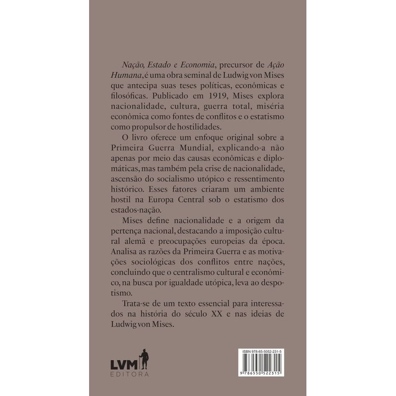 Nação, Estado e Economia é o precursor de Ação Humana, obra-prima de Ludwig von Mises. Publicada em 1919, durante o período entre guerras, a obra aborda temas como nacionalidade, cultura, guerra total, miséria econômica e estatismo, explorando suas relações com os conflitos e hostilidades entre nações. Mises analisa as causas da Primeira Guerra Mundial além das explicações econômicas e diplomáticas tradicionais, destacando a crise da nacionalidade e o ressentimento histórico. Um texto fundamental para interessados na história do século XX e nas ideias de Mises.