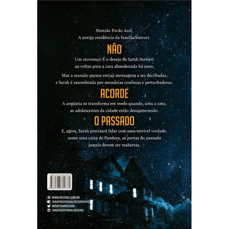 Suspense e sobrenatural se misturam no eletrizante Não acorde o passado. Em busca de um novo começo, Sarah Stewart decide retornar a sua cidade natal para restaurar a velha mansão vitoriana onde cresceu. Suas filhas, Jade e Gracie, não se sentem particularmente animadas ao encontrar o sinistro casarão empoleirado à margem do indomável rio Columbia. No momento em que põe os pés na Mansão Pavão Azul, contudo, Sarah começa a questionar sua decisão. Ela é assolada por lembranças dolorosas da infância — sua mãe fria e cruel, sua meia-irmã Theresa, que desapareceu sem deixar rastros, e a longínqua noite de tempestade em que ela própria foi encontrada vagando no terraço, com febre e delirando. Para completar, desde o brutal assassinato de Angelique Stewart na residência, quase um século atrás, reza a lenda que a mansão é assombrada. Quando menina, Sarah sentia uma presença ali, e logo a caçula Gracie afirma ter visto o fantasma de uma mulher de branco. O esperado recomeço logo se transforma em um terrível pesadelo quando, uma a uma, as adolescentes da cidade começam a desaparecer, e Sarah teme pela segurança de suas filhas naquele casarão onde o mal parece ser o mais antigo residente. Em algum lugar nas profundezas de sua memória está a chave para decifrar um perigo muito real e aterrador. E somente enfrentando seus medos mais obscuros ela pode parar o pesadelo que ameaça voltar à vida mais uma vez… Não acorde o passado é uma história de arrepiar em que a escritora best-seller Lisa Jackson desvenda os terríveis segredos enterrados há décadas numa mansão em ruínas. “Jackson nos leva para o lugar que mais amamos, nosso lar, mas nos faz pensar duas vezes antes de entrar. Excelente leitura!” – Suspense Magazine “Jackson sabe bem como mexer com a cabeça dos leitores.” – Booklist “Leitores que gostam de histórias sinistras com um quê de paranormalidade e ritmo acelerado vão achar difícil largar esse livro! – RT Book Reviews