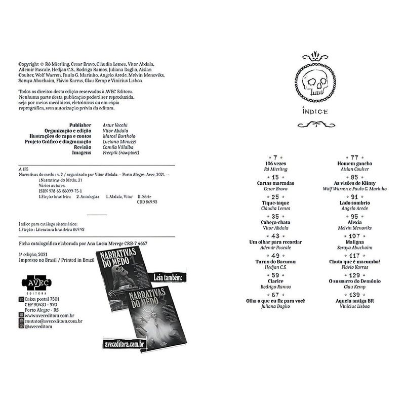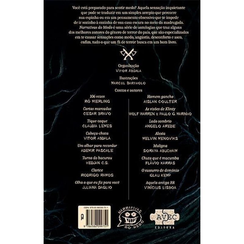 Você está preparado para sentir medo? Aquela sensação inquietante que pode se traduzir em um simples arrepio que percorre sua espinha ou em um pensamento obsessivo que te impede de ir sozinho à cozinha de sua casa escura no meio da madrugada. Narrativas do Medo é uma série de antologias que traz alguns dos melhores autores do gênero de terror do país, que são especializados em te causar sensações como medo, angústia, desconforto e asco, enfim, tudo o que um fã de terror busca em um bom livro. Autores e contos: ADEMIR PASCALE – Um olhar para recordar AISLAN COULTER – Homem gancho ANGELO AREDE – Lado sombrio CESAR BRAVO – Cartas marcadas CLAUDIA LEMES – Tique-taque FLÁVIO KARRAS – Chuta que é macumba! GLAU KEMP – O sussurro do demônio HEDJAN C.S. – Turno do bacurau JULIANA DAGLIO – Olha o que eu fiz pra você MELVIN MENOVIKS – Alexia RÔ MIERLING – Conto: 106 vezes RODRIGO RAMOS – Clarice SORAYA ABUCHAIM – Maligna VINÍCIUS LISBOA – Aquela antiga BR VITOR ABDALA – Cabeça-chata WOLF WARREN e PAULO G. MARINHO – As visões de Klinty