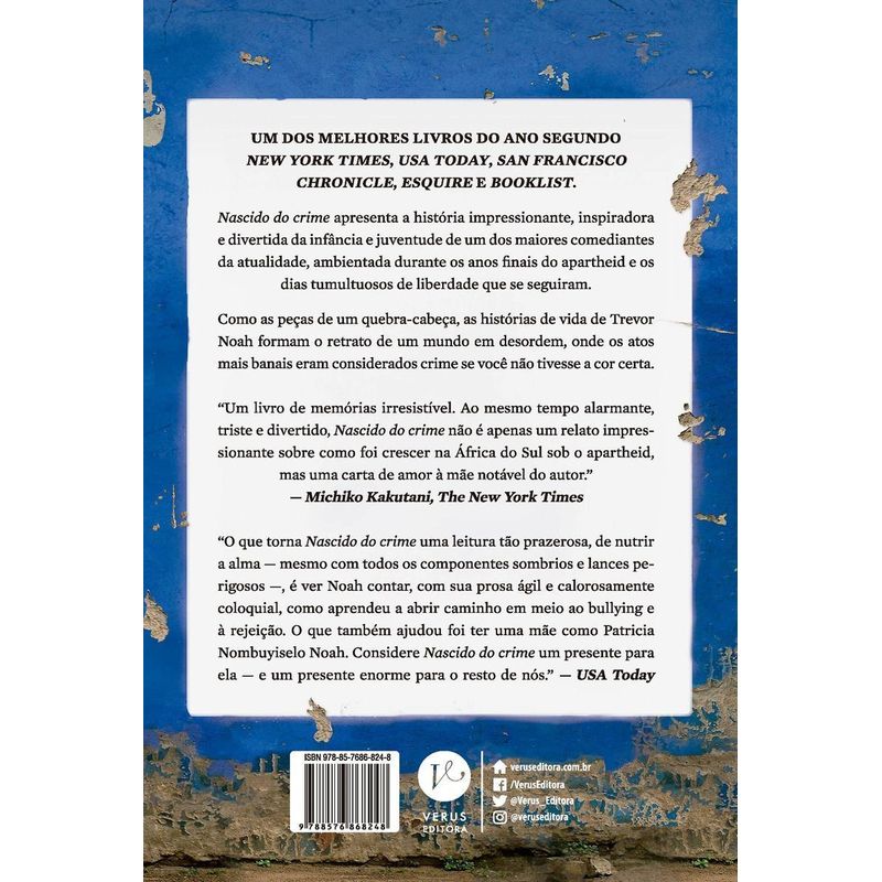 Nascido do crime apresenta a história impressionante, inspiradora e divertida da infância e juventude de Trevor Noah, um dos maiores comediantes da atualidade, ambientada durante os anos finais do apartheid e os dias tumultuosos de liberdade que se seguiram. A jornada extraordinária de Trevor Noah — da infância sob o apartheid, na África do Sul, à bancada de um dos mais importantes talk shows dos Estados Unidos — começou com um ato criminoso: seu nascimento. Trevor nasceu de pai branco e mãe negra, numa época em que essa união era punível com cinco anos de prisão. Prova viva de um crime, ele era mantido em segredo, uma das medidas extremas que sua mãe era obrigada a tomar para escondê-lo do governo, que a qualquer momento poderia levá-lo. Finalmente livres com o fim do apartheid, Trevor e a mãe embarcam numa grande aventura, abraçando as oportunidades conquistadas após séculos de lutas. Nascido do crime é a história de um jovem inquieto, que se sente deslocado tanto nas áreas dos brancos quanto nos subúrbios dos negros. É também a história do relacionamento desse jovem com sua mãe destemida, rebelde e fervorosamente religiosa — uma mulher determinada a salvar o filho do ciclo de pobreza, violência e abusos. As histórias contadas por Trevor Noah são hilárias, dramáticas e profundamente tocantes. Seja jantando lagartas em tempos difíceis, sendo arremessado de um carro em movimento durante uma tentativa de sequestro ou apenas sobrevivendo às armadilhas da vida amorosa na escola, Trevor joga luz em seu mundo com honestidade e humor cortante. Seus textos se entrelaçam para formar um retrato emocionante e divertido de um garoto tentando avançar na vida em uma época turbulenta, armado apenas com senso de humor agudo e o amor incondicional de sua mãe nada comum. “Um livro de memórias irresistível. Ao mesmo tempo alarmante, triste e divertido, Nascido do crime não é apenas um relato impressionante sobre como foi crescer na África do Sul sob o apartheid, mas uma carta de amor à mãe notável do autor.” — Michiko Kakutani, The New York Times. “O que torna Nascido do crime uma leitura tão prazerosa, de nutrir a alma — mesmo com todos os componentes sombrios e lances perigosos —, é ver Noah contar, com sua prosa ágil e calorosamente coloquial, como aprendeu a abrir caminho em meio ao bullying e à rejeição. O que também ajudou foi ter uma mãe como Patricia Nombuyiselo Noah. Considere Nascido do crime um presente para ela — e um presente enorme para o resto de nós.” — USA Today