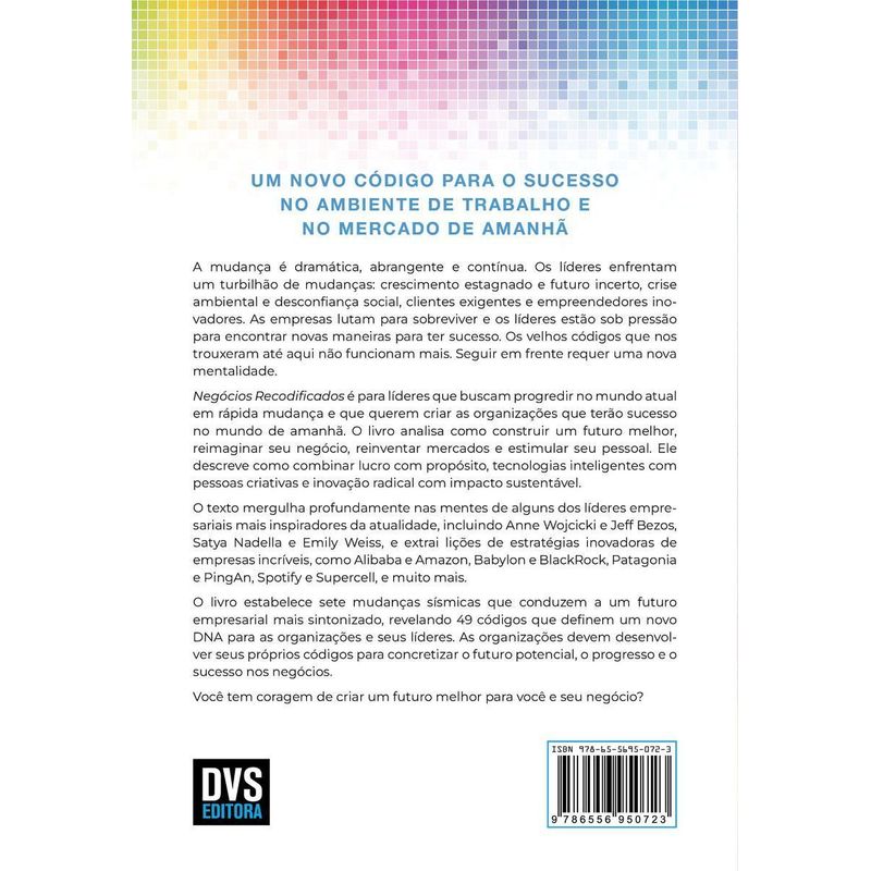 UM NOVO CÓDIGO PARA O SUCESSO NO AMBIENTE DE TRABALHO E NO MERCADO DE AMANHÃ A mudança é dramática, abrangente e contínua. Os líderes enfrentam um turbilhão de mudanças: crescimento estagnado e futuro incerto, crise ambiental e desconfiança social, clientes exigentes e empreendedores inovadores. As empresas lutam para sobreviver e os líderes estão sob pressão para encontrar novas maneiras para ter sucesso. Os velhos códigos que nos trouxeram até aqui não funcionam mais. Seguir em frente requer uma nova mentalidade. Negócios Recodificados é para líderes que buscam progredir no mundo atual em rápida mudança e que querem criar as organizações que terão sucesso no mundo de amanhã. O livro analisa como construir um futuro melhor, reimaginar seu negócio, reinventar mercados e estimular seu pessoal. Ele descreve como combinar lucro com propósito, tecnologias inteligentes com pessoas criativas e inovação radical com impacto sustentável. O texto mergulha profundamente nas mentes de alguns dos líderes empresariais mais inspiradores da atualidade, incluindo Anne Wojcicki e Jeff Bezos, Satya Nadella e Emily Weiss, e extrai lições de estratégias inovadoras de empresas incríveis, como Alibaba e Amazon, Babylon e BlackRock, Patagonia e PingAn, Spotify e Supercell, e muito mais. O livro estabelece sete mudanças sísmicas que conduzem a um futuro empresarial mais sintonizado, revelando 49 códigos que definem um novo DNA para as organizações e seus líderes. As organizações devem desenvolver seus próprios códigos para concretizar o futuro potencial, o progresso e o sucesso nos negócios. Você tem coragem de criar um futuro melhor para você e seu negócio?