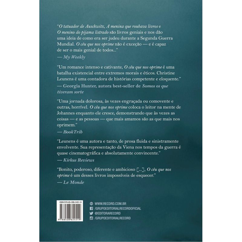 O livro que inspirou o filme Jojo Rabbit, do diretor Taika Waititi, vencedor do Oscar de Melhor Roteiro Adaptado; para fãs dos best-sellers A menina que roubava livros e O menino do pijama listrado.“Um desses livros impossíveis de esquecer.” — Le MondeComo muitos meninos austríacos na época da anexação da Áustria ao Reich alemão, no fim da década de 1930, Johannes Betzler abraça inocentemente o sonho nazista. Integrante da Juventude Hitlerista, ele descobre que seus pais estão escondendo uma jovem judia, Elsa Kor, atrás de uma pa falsa em sua casa, em Viena. Seu horror inicial vira interesse, depois amor e obsessão. Após o desaparecimento de seus pais, Johannes descobre que ele é a única pessoa ciente da existência de Elsa e único responsável por sua sobrevivência. Manipulando e sendo manipulado, Johannes teme o fim da guerra: com isso virá a perspectiva de perder Elsa e um relacionamento que varia entre paixão e obsessão, dependência e indiferença, amor e ódio.Best-seller internacional, vendido em mais de vinte países, O céu que nos oprime é uma obra emocionante e magistral que examina verdades e mentiras nos níveis político e pessoal, revelando os aspectos mais sombrios da alma humana. Serviu de inspiração para o filme Jojo Rabbit, do diretor Taika Waititi (Thor: Ragnarok). Estrelado por Sam Rockwell e Scarlet Johansson, o longa venceu o Oscar de Melhor Roteiro Adaptado, além de ter sido agraciado com outros prêmios, como o Critics’ Choice Award, o Writers Guild of America e o BAFTA de Cinema.“Um romance intenso e cativante, O céu que nos oprime é uma batalha existencial entre extremos morais e éticos.” — Georgia Hunter, autora best-seller de Somos os que tiveram sorte“Uma jornada dolorosa, às vezes engraçada ou comovente, outras vezes horrível. O céu que nos oprime coloca o leitor na mente de Johannes enquanto ele cresce, demonstrando que às vezes as coisas — e as pessoas — que mais amamos são as que mais nos oprimem.” — BookTrib“Christine Leunens é uma autora e tanto, de prosa fluida e sinistramente envolvente. Sua representação da Viena nos tempos da guerra é quase cinematográfica e absolutamente convincente.” — Kirkus Reviews “O tatuador de Auschwitz, A menina que roubava livros e O menino do pijama listrado são livros geniais e nos dão uma ideia de como era ser judeu durante a Segunda Guerra Mundial. O céu que nos oprime não é exceção — e é capaz de ser o mais genial de todos…” — My Weekly