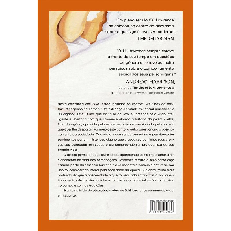 “Coletânea exclusiva de contos do autor de O amante de Lady Chatterley. Nesta coletânea exclusiva, estão incluídos os seguintes contos: “As filhas do pastor”, “O espinho na carne”, “Um estilhaço de vitral”, “O oficial prussiano” e “O cigano”. Este último, que dá título ao livro, surpreende pela lucidez do ponto de vista do autor, ainda na década de 1920. É por meio da história da jovem Yvette, filha do vigário, oprimida pela avó e pelas tias e pressionada pelo homem que quer lhe desposar, que Lawrence questiona o posicionamento da sociedade. Quando a moça sai de sua rotina e permite-se ter sentimentos por um misterioso cigano que cruzou seu caminho, suas crenças são colocadas em xeque e ela compreende ser protagonista de sua própria vida. O desejo permeia todas as histórias, aparecendo como importante direcionamento na vida dos personagens. Lawrence retrata o sexo como algo natural, parte da essência humana e que conecta o homem à natureza, tendo por isso sido considerado imoral pela sociedade da época. Sua obra, muito mais profunda do que a obscenidade à que foi reduzida então, traz ainda questionamentos de caráter social e o contraste da industrialização com a vida no campo e com as tradições. Mesmo tendo sido escrita no início do século XX, a obra de D. H. Lawrence permanece atual e instigante. “D. H. Lawrence sempre esteve à frente de seu tempo em questões de gênero e se revelou muito perspicaz sobre o comportamento sexual dos seus personagens.” – Andrew Harrison, autor de The Life of D. H. Lawrence e diretor do D. H. Lawrence Research Centre “