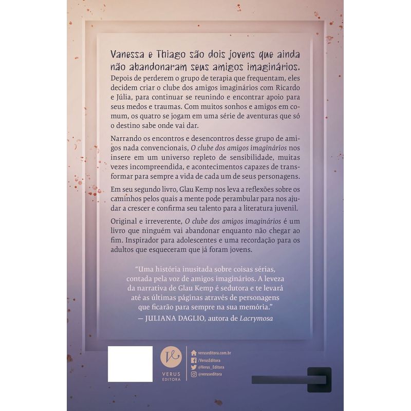 Às vezes amigos imaginários podem ser a nossa melhor companhia. Ou não… Vanessa e Thiago são dois jovens que ainda não abandonaram seus amigos imaginários. Depois de perderem o grupo de terapia que frequentam, eles decidem criar o clube dos amigos imaginários com Ricardo e Júlia, para continuar se reunindo e encontrar apoio para seus medos e traumas. Com muitos sonhos e amigos em comum, os quatro se jogam em uma série de aventuras que só o destino sabe onde vai dar.Narrando os encontros e desencontros desse grupo de amigos nada convencionais, O clube dos amigos imaginários nos insere em um universo repleto de sensibilidade, muitas vezes incompreendida, e acontecimentos capazes de transformar para sempre a vida de cada um de seus personagens.Em seu segundo livro, Glau Kemp nos leva a reflexões sobre os caminhos pelos quais a mente pode perambular para nos ajudar a crescer e confirma seu talento para a literatura juvenil.Original e irreverente, O clube dos amigos imaginários é um livro que ninguém vai abandonar enquanto não chegar ao fim. Inspirador para adolescentes e uma recordação para os adultos que esqueceram que já foram jovens. A Voz — o amigo imaginário dele.Eu sou a voz dentro da cabeça dele e garanto: sou a parte menos louca desse garoto. Vou contar esta história para vocês, mas saibam que não é uma trama qualquer de adolescentes mimizentos! Só acontece coisa de maluco; tudo em que esse garoto se mete dá errado. Então esta é uma história real sobre amigos imaginários. Uma história de sexo adolescente, que consiste em mão na bunda por cima da calça jeans. Uma história de violência, basicamente sobre tapas que não acertam a cara de ninguém. E uma história de amizade que reúne quatro jovens insanos e seus amigos imaginários. Pessoas vão morrer, se apaixonar, enlouquecer e recuperar a sanidade. Não nessa ordem, senão seria uma história de zumbis. E isto aqui é sério. O Urso Bobo — o amigo imaginário dela.Eu vou morrer… Esse é o grande spoiler da vida, um dia a gente morre. Então não quero ninguém chorando em cima de mim, me banhando em saliva e meleca. Porque esta é uma história feliz, de amor, amizade e superação. Uma história real sobre amigos imaginários, em que eu acabo morrendo no final. Mas quero contar para vocês como foram os últimos e gloriosos dezessete anos. Os mais loucos que alguém poderia ter. Os anos em que fui o Urso Bobo de pelúcia da Vanessa. A garota mais legal do mundo e meu grande amor. “Uma história inusitada sobre coisas sérias, contada pela voz de amigos imaginários. A leveza da narrativa de Glau Kemp é sedutora e te levará até as últimas páginas através de personagens que ficarão para sempre na sua memória.” — Juliana Daglio, autora de Lacrymosa