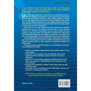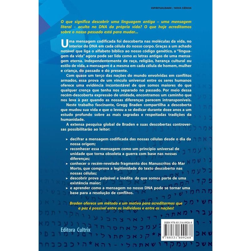 Uma mensagem codificada foi descoberta nas moléculas da vida, no interior do DNA em cada célula do nosso corpo. Graças a um achado notável que liga o alfabeto bíblico ao nosso código genético, a “linguagem da vida” agora pode ser lida como as letras antigas de uma mensagem eterna. Neste trabalho fascinante, Gregg Braden compartilha a descoberta que mudou sua vida e que o levou a se dedicar durante doze anos a um estudo profundo sobre as mais sagradas e respeitadas tradições da humanidade. A extensa pesquisa global do autor e suas descobertas controversas possibilitarão ao leitor decifrar a mensagem codificada nas nossas células desde o dia da nossa origem e aprender como a mensagem no nosso DNA pode se tornar uma base para a resolução de conflitos.