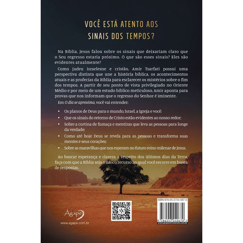 Você está atento aos sinais dos tempos? Na Bíblia, Jesus falou sobre os sinais que deixariam claro que o Seu regresso estaria próximo. O que são esses sinais? Eles são evidentes atualmente? Como judeu israelense e cristão, Amir Tsarfati possui uma perspectiva distinta que une a história bíblica, os acontecimentos atuais e as profecias da Bíblia para esclarecer os mistérios sobre o fim dos tempos. A partir de seu ponto de vista privilegiado no Oriente Médio e por meio de um estudo bíblico meticuloso, Amir aponta para provas que nos informam que o regresso do Senhor é iminente. Em O dia se aproxima, você vai entender: • Os planos de Deus para o mundo, Israel, a Igreja e você; • Que os sinais do retorno de Cristo estão evidentes ao nosso redor; • Sobre a cortina de fumaça e mentiras que leva as pessoas para longe da verdade; • Como até hoje Deus se revela para as pessoas e transforma suas mentes e seus corações; • Sobre as maravilhas que nos esperam no futuro reino milenar de Jesus. Ao buscar esperança e clareza a respeito dos últimos dias da Terra, faça com que a Bíblia seja o único recurso ao qual você recorre em busca de respostas