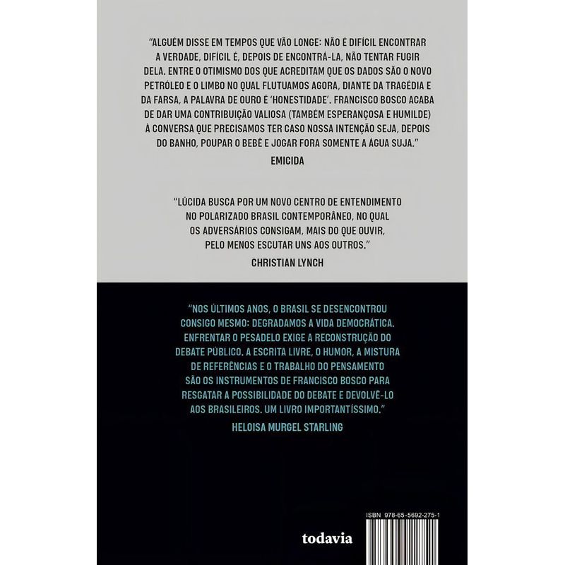Francisco Bosco é um tipo raro de intelectual. Sua formação é ampla, como a dos melhores ensaístas. Neste livro, os traços que o notabilizaram em obras anteriores aparecem em sua potência máxima. O tema escolhido não é trivial: simplesmente a encrenca em que o Brasil se meteu nos últimos tempos, que desaguou na eleição de um presidente avesso à democracia e na devastação do debate público, transformando adversários em inimigos e a arena de ideias num ringue de mentecaptos. O ponto de partida é uma “limpeza da situação verbal”: Bosco recorre à melhor literatura política e econômica para desbastar o terreno e restituir complexidade às noções de liberalismo, socialismo, comunismo, identitarismo, entre tantas outras que se esvaziaram nas s digitais. O autor identifica duas fraturas na identidade brasileira: a cultura popular e a democracia. Esses dois pilares da autoimagem nacional foram rachados nos últimos tempos, deixando um rastro de ressentimento e violência. O caminho que conduz ao diálogo parte desse diagnóstico trágico, mas decisivo para restaurar a possibilidade do debate. O diálogo possível é um convite para que sentem à mesma mesa os que estão dispostos a discutir saídas para o país.