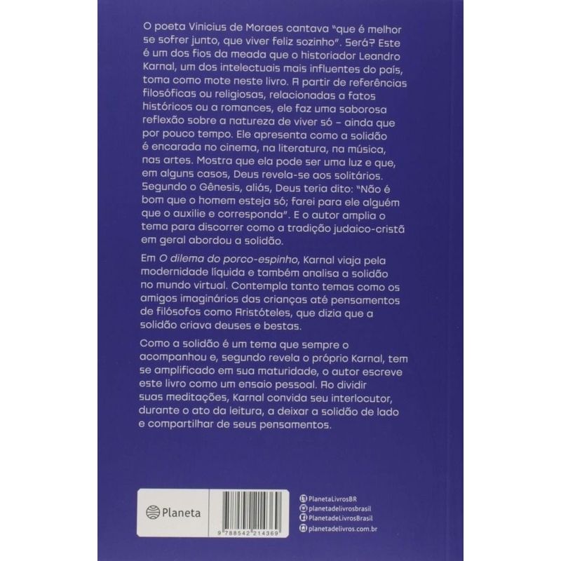 O poeta Vinicius de Moraes cantava “que é melhor se sofrer junto, que viver feliz sozinho”. Será? O historiador Leandro Karnal, um dos intelectuais brasileiros que, através de seus livros, palestras e vídeos, nos ajuda a pensar o mundo contemporâneo, discute uma questão presente na vida de todos: a solidão. A partir de referências de filósofos e da própria Bíblia, de fatos históricos e de romances, ele faz uma reflexão sobre a natureza de viver só – por pouco ou muito tempo, estando ou não acompanhado. Apresenta como a solidão é encarada no cinema, na literatura, na música, nas artes. Mostra que ela pode ser iluminadora e como Deus se revela aos solitários. O mesmo Deus que, segundo Gêneses, teria dito: “Não é bom que o homem esteja só; farei para ele alguém que o auxilie e corresponda.” E expõe como se desenvolveu a tradição judaico-cristã da solidão. Em O dilema do porco-espinho, Karnal viaja pela modernidade líquida e analisa a solidão no mundo virtual e o isolamento. Discute dos amigos imaginários criados pelas crianças aos pensamentos de alguns filósofos, como Aristóteles, que dizia que a solidão criava deuses e bestas. Como a solidão é um tema que sempre o acompanhou e, segundo revela o próprio Karnal, tem crescido na maturidade, o autor escreve este livro como um ensaio pessoal. Ao dividir suas meditações, o autor convida o leitor, durante o ato da leitura, a deixar a solidão de lado e compartilhar seus pensamentos também.