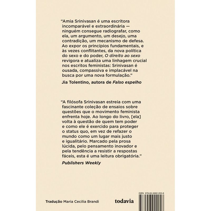 Este livro traz seis ensaios que inovam a maneira como discutimos — ou evitamos discutir — a ética e as políticas relativas ao sexo. Apesar de ser um ato privado, o sexo é carregado de sentido público. Para compreender o sexo na sua complexidade — suas profundas ambivalências, sua relação com gênero, classe, raça e poder — é preciso pensar muito além do sim e do não, do desejado e do indesejado. É o que faz a jovem e brilhante filósofa Amia Srinivasan nesta obra.