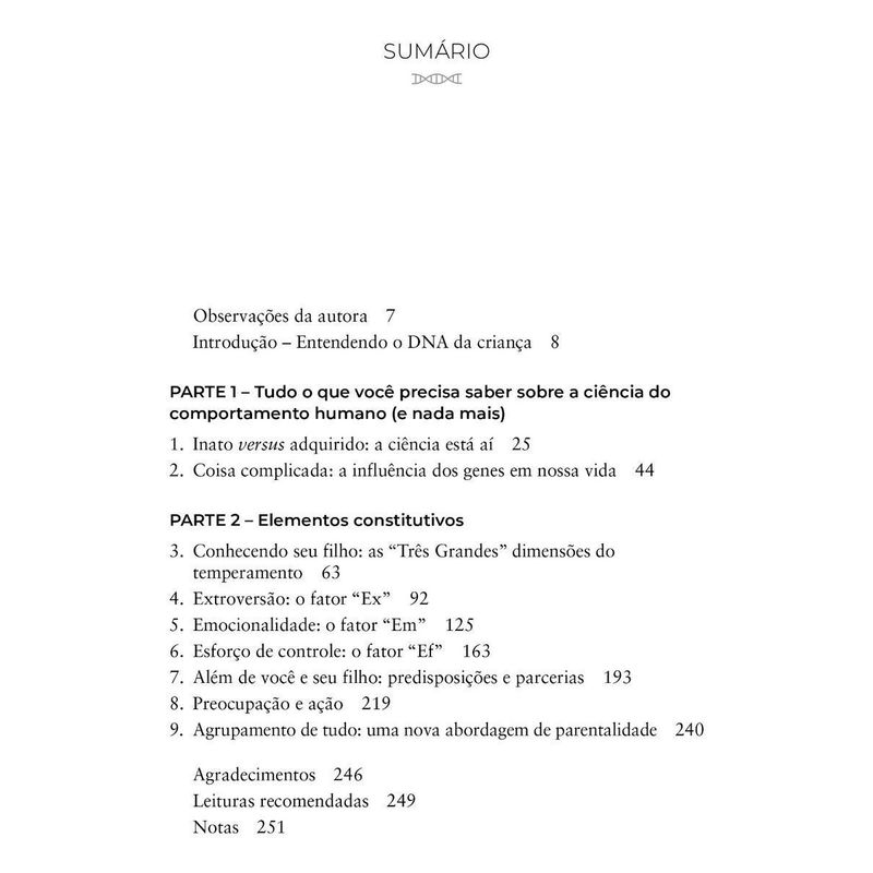 “Uma leitura fascinante e com soluções práticas.” – Judson Brewer, autor do best-seller “Desconstruindo a ansiedade” E se a ciência pudesse tornar você um pai ou uma mãe melhor? Conheça esta nova – e provocante – abordagem para a parentalidade Neste livro, Danielle Dick – PhD em Psicologia, pós-doutora em Genética e premiada pesquisadora – traduz o papel da ciência presente no comportamento dos nossos filhos de modo claro e direto. Com base em suas pesquisas, ela apresenta aos leitores os três Es, ou seja, as três grandes dimensões do temperamento, que regem a predisposição única de cada criança: extroversão (Ex), emocionalidade (Em) e esforço de controle (Ef). A partir deles, a pesquisadora mostra que o segredo para criar adultos bem-sucedidos não está em moldar os filhos, mas em fazer os pais entenderem a natureza única que reside em cada criança, adaptando à predisposição genética delas as diferentes técnicas de parentalidade. Cada capítulo desvenda a ciência dessa abordagem, fornecendo estratégias práticas e específicas para os diferentes perfis de temperamento. Assim, os pais estarão munidos de conhecimento para apoiar os pontos fortes dos filhos e ajudá-los nos desafios. Tranquilizador, com lições reais e conteúdo sábio, “O DNA da criança” oferece uma mensagem inspiradora: o maior trabalho de um adulto é ajudar as crianças a se tornarem quem elas literalmente nasceram para ser.