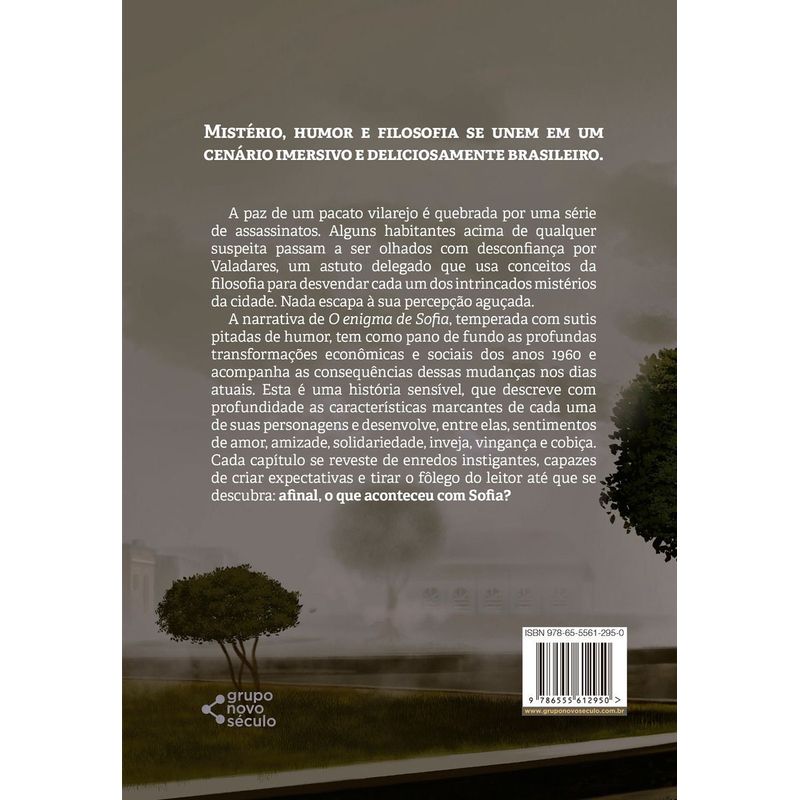 A paz de um pacato vilarejo é quebrada por uma série de assassinatos. Alguns habitantes acima de qualquer suspeita passam a ser olhados com desconfiança por Valadares, um astuto delegado que usa conceitos da filosofia para desvendar cada um dos intrincados mistérios da cidade. Nada escapa à sua percepção aguçada. A narrativa de O enigma de Sofia, temperada com sutis pitadas de humor, tem como pano de fundo as profundas transformações econômicas e sociais dos anos 1960 e acompanha as consequências dessas mudanças nos dias atuais. Esta é uma história sensível, que descreve com profundidade as características marcantes de cada uma de suas personagens e desenvolve, entre elas, sentimentos de amor, amizade, solidariedade, inveja, vingança e cobiça. Cada capítulo se reveste de enredos instigantes, capazes de criar expectativas e tirar o fôlego do leitor até que se descubra: afinal, o que aconteceu com Sofia?