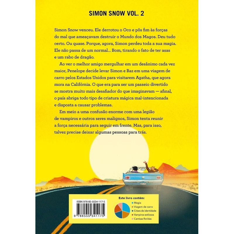 O aguardado segundo volume da série Simon Snow chega ao Brasil. Simon Snow venceu. Ele pôs fim às forças do mal que ameaçavam destruir o Mundo dos Magos. Tudo deu certo. Ou quase. Porque, agora, Simon perdeu toda a sua magia. Ele não passa de um normal… Bom, tirando o fato de ter asas e um rabo de dragão. Vendo o melhor amigo mergulhar em um desânimo cada vez maior, Penelope decide levar Simon e Baz em uma viagem de carro para visitarem Agatha, que agora mora na Califórnia. O que era para ser um passeio divertido se mostra muito mais desafiador do que imaginavam. Afinal, os Estados Unidos abrigam todo tipo de criatura mágica mal-intencionada e disposta a causar problemas. Em meio a uma confusão enorme com uma legião de vampiros e outros seres malignos, talvez Simon finalmente seja capaz de reunir a força necessária para seguir em frente — e deixar algumas pessoas para trás.