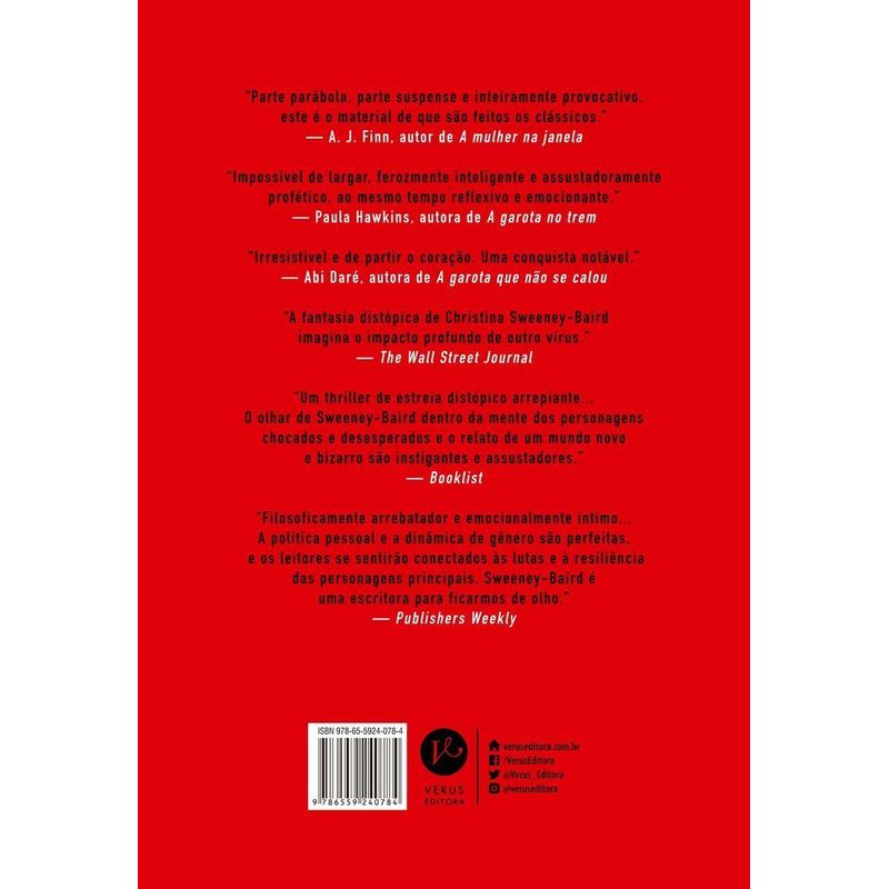 Só os homens contraem o vírus. Só as mulheres podem salvar o mundo. Tendo como cenário um mundo onde um vírus ataca apenas a população masculina, O fim dos homens é uma estreia eletrizante e inesquecível. O ano é 2025 e um vírus misterioso eclodiu na Escócia — uma doença letal que parece afetar apenas homens. Ao constatar esse fenômeno, a dra. Amanda MacLean é tida como desequilibrada. No momento em que ela realmente é ouvida, já é tarde demais. A doença se torna uma pandemia global — e política. As vítimas são todos os homens, de qualquer idade. E o mundo se torna um mundo de mulheres. O que se segue são os relatos imersivos das mulheres que precisaram lidar com as consequências do vírus, narrados em primeira pessoa. Dra. Amanda; Catherine, uma historiadora social determinada a documentar as experiências humanas por trás da “praga masculina”; a analista de inteligência Dawn, encarregada de ajudar o governo a forjar uma nova sociedade; e Elizabeth, uma das muitas cientistas que trabalham desesperadamente para desenvolver uma vacina. Pelos olhos dessas mulheres e de outras, vemos as inúmeras maneiras pelas quais a ausência dos homens mudou a sociedade – do aspecto pessoal, como a perda de maridos e filhos, ao político, como as mudanças na força de trabalho, na fertilidade e no significado de família. Levantando a questão “Como seria realmente a vida sem os homens?”, Christina Sweeney-Baird cria em O fim dos homens uma história inesquecível de perda, resiliência e esperança. “Parte parábola, parte suspense e inteiramente provocativo, este é o material de que são feitos os clássicos.” – A. J. Finn, autor de A mulher na janela “Impossível de largar, ferozmente inteligente e assustadoramente profético, ao mesmo tempo reflexivo e emocionante.” – Paula Hawkins, autora de A garota no trem “Irresistível e de partir o coração. Uma conquista notável.” – Abi Daré, autora de A garota que não se calou “A fantasia distópica de Christina Sweeney-Baird imagina o impacto profundo de outro vírus.” – The Wall Street Journal “Um thriller de estreia distópico arrepiante… O olhar de Sweeney-Baird dentro da mente dos personagens chocados e desesperados e o relato de um mundo novo e bizarro são instigantes e assustadores.” – Booklist “Filosoficamente arrebatador e emocionalmente íntimo… A política pessoal e a dinâmica de gênero são perfeitas, e os leitores se sentirão conectados às lutas e à resiliência das personagens principais. Sweeney-Baird é uma escritora para ficarmos de olho.” – Publishers Weekly