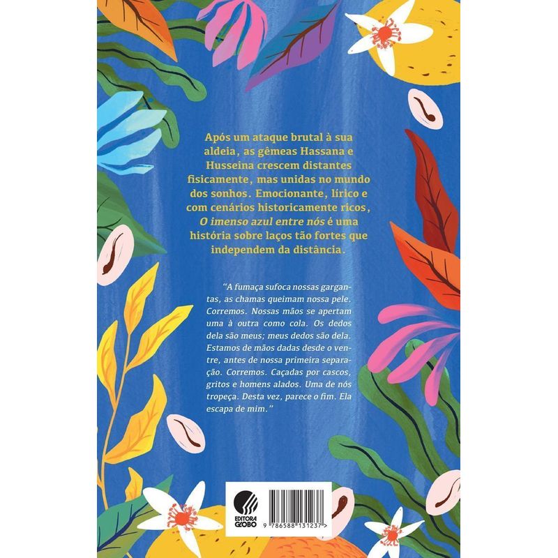 Jovens irmãs separadas. Uma no Brasil e a outra na África. Emocionante, lírico e com cenários historicamente ricos, O imenso azul entre nós é uma história sobre laços tão fortes que independem da distância As gêmeas Hassana e Husseina são separadas após um ataque brutal à sua aldeia, em 1892. A partir desse traumático evento, ambas são escravizadas e seguem caminhos separados, que as levam a diferentes cidades, países e até continentes. Enquanto Hassana fica na Costa do Ouro africana, Husseina cruza o oceano até a Bahia, onde é iniciada no Candomblé. Com o passar do tempo, as irmãs crescem e levam vidas completamente diferentes em muitos aspectos, mas com algo em comum: o sentimento de que há algo faltando. Apesar da distância, elas continuam ligadas uma à outra por meio de seus sonhos. Mas será que o destino as reunirá novamente?