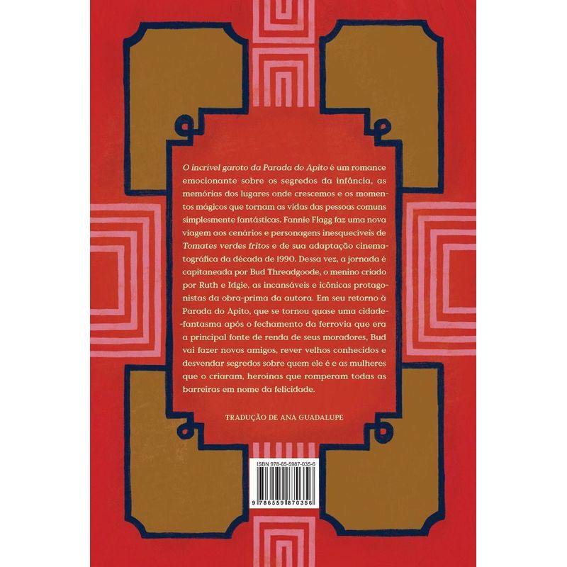 A tão aguardada continuação de Tomates verdes fritos Bud Threadgoode cresceu na fervilhante Parada do Apito, uma cidadezinha às margens de uma ferrovia. Ele foi criado por sua mãe, a séria e carola Ruth, e Idgie, a quem chamava de tia, uma mulher à frente de seu tempo, que adorava se divertir e quebrar as convenções. Juntas, elas criaram uma cafeteria que se tornou uma das maiores atrações das redondezas, conhecida pelo ambiente descontraído e seus famosos tomates verdes fritos, a especialidade da casa. Porém, para a total tristeza de Bud, a estrada de ferro que sustentava a cidade foi desativada e a Parada do Apito se tornou uma cidade-fantasma. Tomado pela saudade de sua infância, Bud decide fazer uma última viagem ao lugar onde nasceu, cresceu e aprendeu as lições mais valiosas da sua vida. Seu desejo é simplesmente ver o que sobrou de sua tão amada Parada do Apito. Nessa jornada, Bud vai fazer novos amigos, rever velhos conhecidos e desvendar segredos sobre quem ele é e as mulheres que o criaram, heroínas que romperam todas as barreiras em nome da felicidade. Em O incrível garoto da Parada do Apito, Fannie Flagg faz uma nova viagem aos cenários e personagens inesquecíveis de Tomates verdes fritos e sua adaptação cinematográfica da década de 1990. O livro é um romance emocionante sobre os segredos da infância, as memórias dos lugares onde crescemos e os momentos mágicos que tornam as vidas das pessoas comuns simplesmente fantásticas.