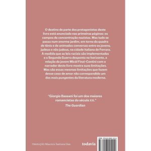 O destino de parte dos protagonistas deste livro está anunciado nas primeiras páginas: os campos de concentração nazistas. Mas tudo se passa num enorme jardim na cidade italiana de Ferrara. À medida que a Segunda Guerra desponta, a relação da jovem Micòl Finzi-Contini com o narrador deste livro mostra suas limitações. Mas são essas mesmas limitações que fazem desse caso de amor não correspondido um dos mais pungentes da literatura moderna.