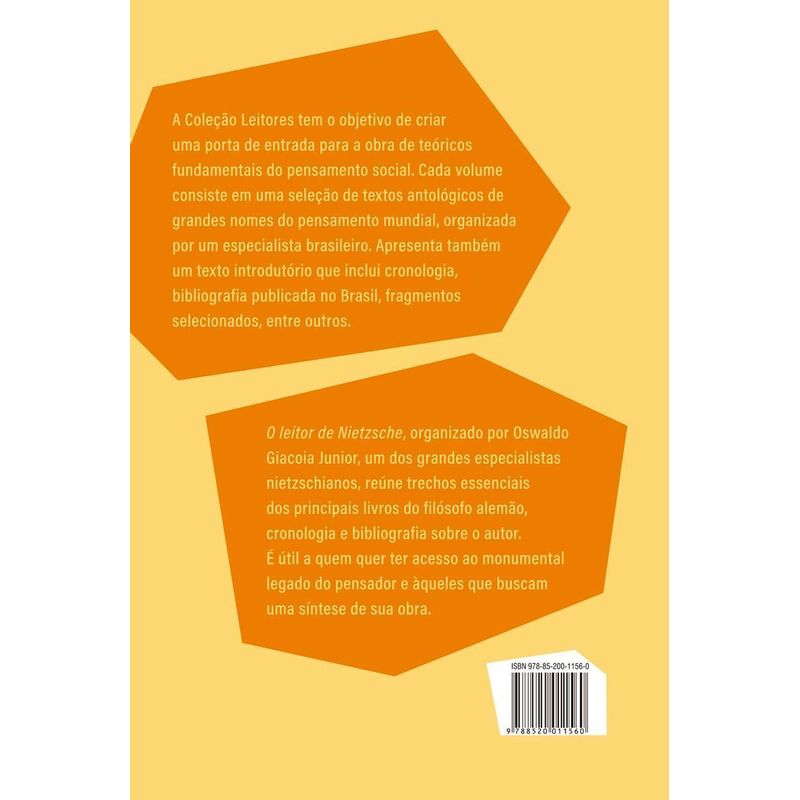 Antologia reúne os textos essenciais de Nietzsche, comentados por um de seus dos maiores especialistas brasileiros Em O leitor de Nietzsche, antologia organizada por Oswaldo Giacoia Junior – um dos maiores especialistas na obra do pensador –, a produção intelectual do filósofo alemão tem seu percurso reconstituído e suas partes integrantes interligadas. Desde o princípio, Nietzsche foi considerado um pensador trágico. E, neste livro, a tragédia é o fio condutor de uma reflexão acerca de toda a sua produção teórica.É curioso pensar que Friedrich Nietzsche, um dos mais polêmicos, provocativos e influentes filósofos modernos, jamais teve uma formação especializada em filosofia. Optou, em vez disso, pela formação em filologia clássica, que na época compreendia conhecimentos de línguas clássicas, arqueologia, crítica histórica e história da filosofia, da literatura e da arte antigas. Apesar de uma profícua produção intelectual, que deixou um legado indelével na cultura ocidental, Nietzsche não chegou a ser celebrado em seu tempo. Em vida, como docente ou escritor, nunca teve expressivo sucesso. Os anos de atividade intelectual também não foram duradouros, considerando que seu primeiro livro — O nascimento da tragédia — foi publicado em 1872, e, em 1889, o pensador sofreu uma síncope mental, que o privou da razão em definitivo.Um dos principais objetivos da produção teórica de Nietzsche foi a investigação histórica acerca da origem dos valores morais radiculares da cultura ocidental. A partir dessa espinha dorsal, ele enfim traçou uma grave crítica dos valores cultuados pela modernidade. Na segunda metade do século XIX, ele já apontava a tendência de nossa civilização a uma dinâmica de poder e dominação, que pretendia rebaixar a autonomia e a autenticidade da personalidade humana, em favor da padronização e da uniformização cultural. Isso ocorria à medida que o homem moderno se tornava subserviente a um ideal de felicidade que preza por conforto, bem-estar, segurança, prazer, ausência de sofrimento etc.Sua crítica antecipou debates centrais para o século XX, como aqueles em torno do autoritarismo e do totalitarismo, do modernismo cultural e da cultura de massa. O papel precursor de sua obra insere seu nome entre as leituras fundamentais a todo pensador da cultura e da sociedade de nosso tempo.O leitor de Nietzscheé útil a quem quer ter acesso ao monumental legado do pensador e àqueles e àquelas que buscam uma síntese de sua obra. O volume faz parte da Coleção Leitores, que tem o objetivo de criar uma porta de entrada para a obra de teóricos fundamentais do pensamento social. Cada volume consiste em uma seleção de textos antológicos de grandes nomes do pensamento mundial, organizada por um especialista brasileiro. Apresenta também um texto introdutório que inclui cronologia, bibliografia publicada no Brasil, fragmentos selecionados, entre outros.
