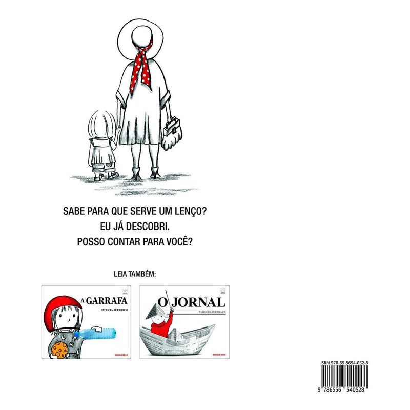 Crie suas próprias histórias e seja quem você quiser no segundo título da coleção de livros-imagem Objetos Brincantes, uma divertida celebração à imaginação infantil. Uma menina está em casa sem ter o que fazer quando vê um incrível, fantástico, maravilhoso lenço vermelho com bolinhas brancas! A partir daí, o seu dia se torna uma grande aventura: ela ganha um cachorro, viaja no tempo e se torna médica! Essa peça comum de nosso vestuário vai se transformando a cada virada de página — uma vela, um penteado, um vestido de princesa, um manto real — mostrando toda a força da criatividade infantil. Buscando dar mais unidade visual à coleção de livros-imagem, que conta também com os títulos O jornal, de 2012, e A garrafa, de 2018, fizeram-se pequenas adaptações no projeto gráfico dessa nova edição de O lenço. Com narrativas sensíveis, inteligentes e bem-humoradas, todos os livros da coleção Objetos Brincantes transformam simples objetos de nosso dia a dia em bilhetes de viagem para mundos fantásticos! Indicado para leitores a partir de 4 anos.