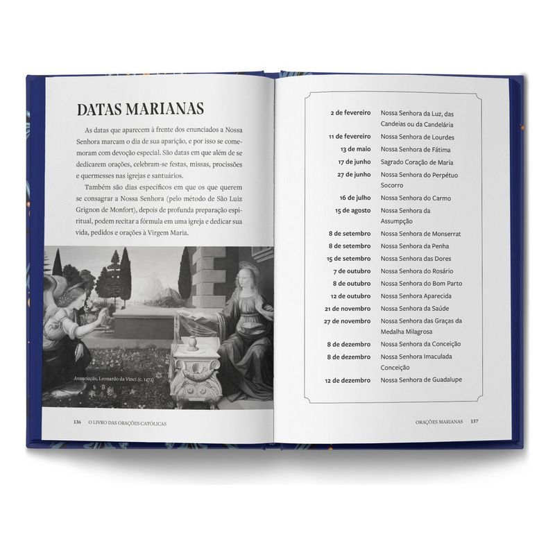 “TUDO O QUE PEDIRDES COM FÉ NA ORAÇÃO, VÓS O ALCANÇAREIS” – MT 21:22 O Livro das Orações Católicas reúne as preces mais tradicionais do Catolicismo, desde as fórmulas essenciais, como o Sinal da Cruz, até as orações dedicadas aos santos e santas que iluminam sua caminhada espiritual. Como um verdadeiro guia, traz ainda um passo a passo completo para a reza dos terços e rosários, com explicações detalhadas sobre suas liturgias, incentivando o leitor a vivenciar diariamente a riqueza da tradição católica. † 120+ orações e preces, das mais tradicionais às direcionadas para cada santo † Orações separadas para cada momento do dia † Principais orações em latim † Explicações simples e diretas sobre simbologias, rituais e santos católicos † Manual de como rezar o terço e o rosário † Passo a passo da Liturgia das Horas